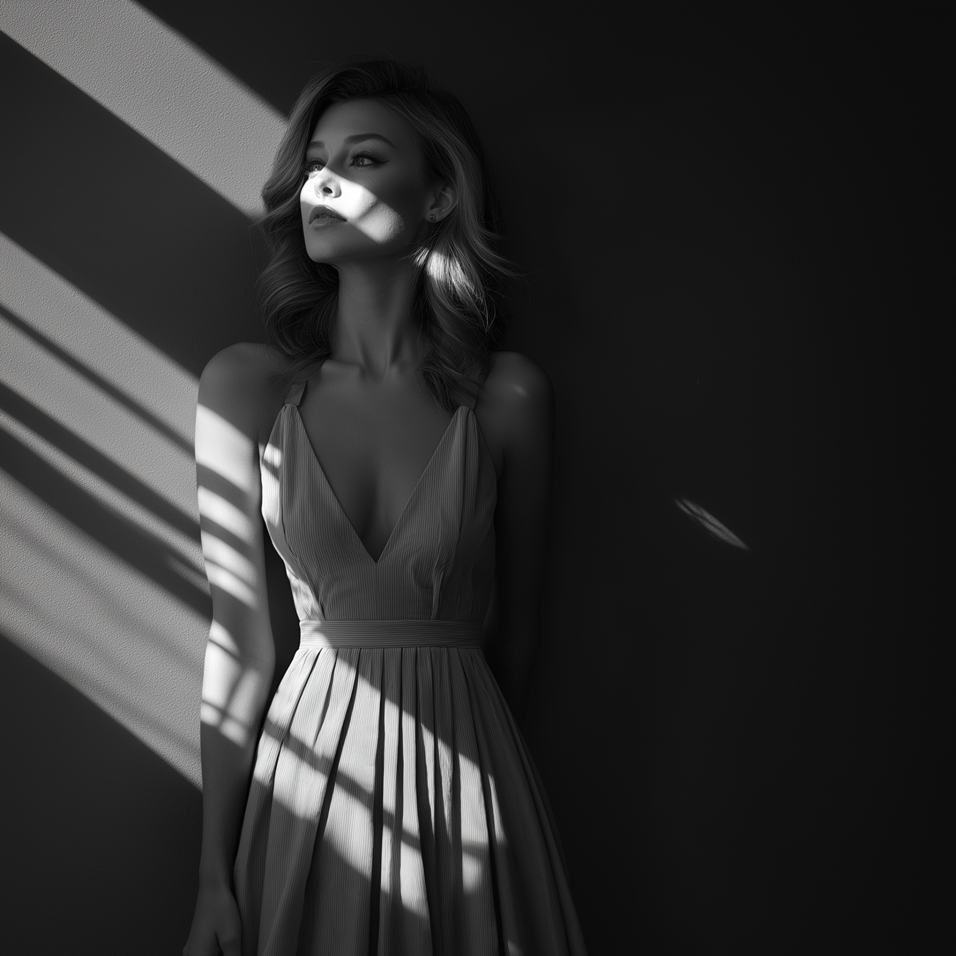 This image captures a slender, tall woman in a dramatic black and white setting, with sunlight filtering through shades to create an ethereal mood. The hyper-realistic style of the photography emphasizes the beauty and grace of the figure, evoking a sense of nostalgia and artistry.