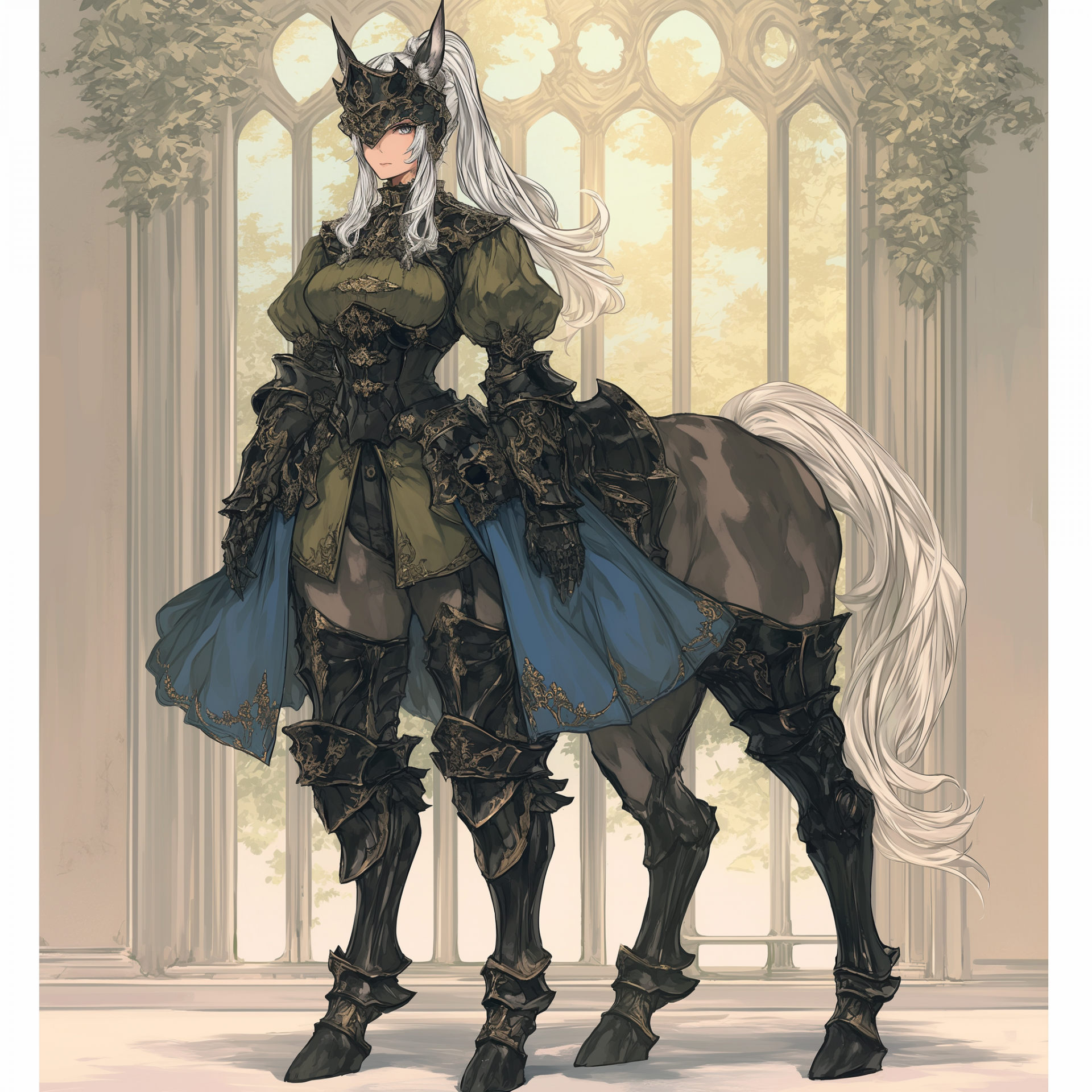 This illustration depicts a centaur girl standing gracefully in exquisite clothing, showcasing her full growth. She features striking white hair and wears a decorative mask, contributing to a magical and whimsical atmosphere.
