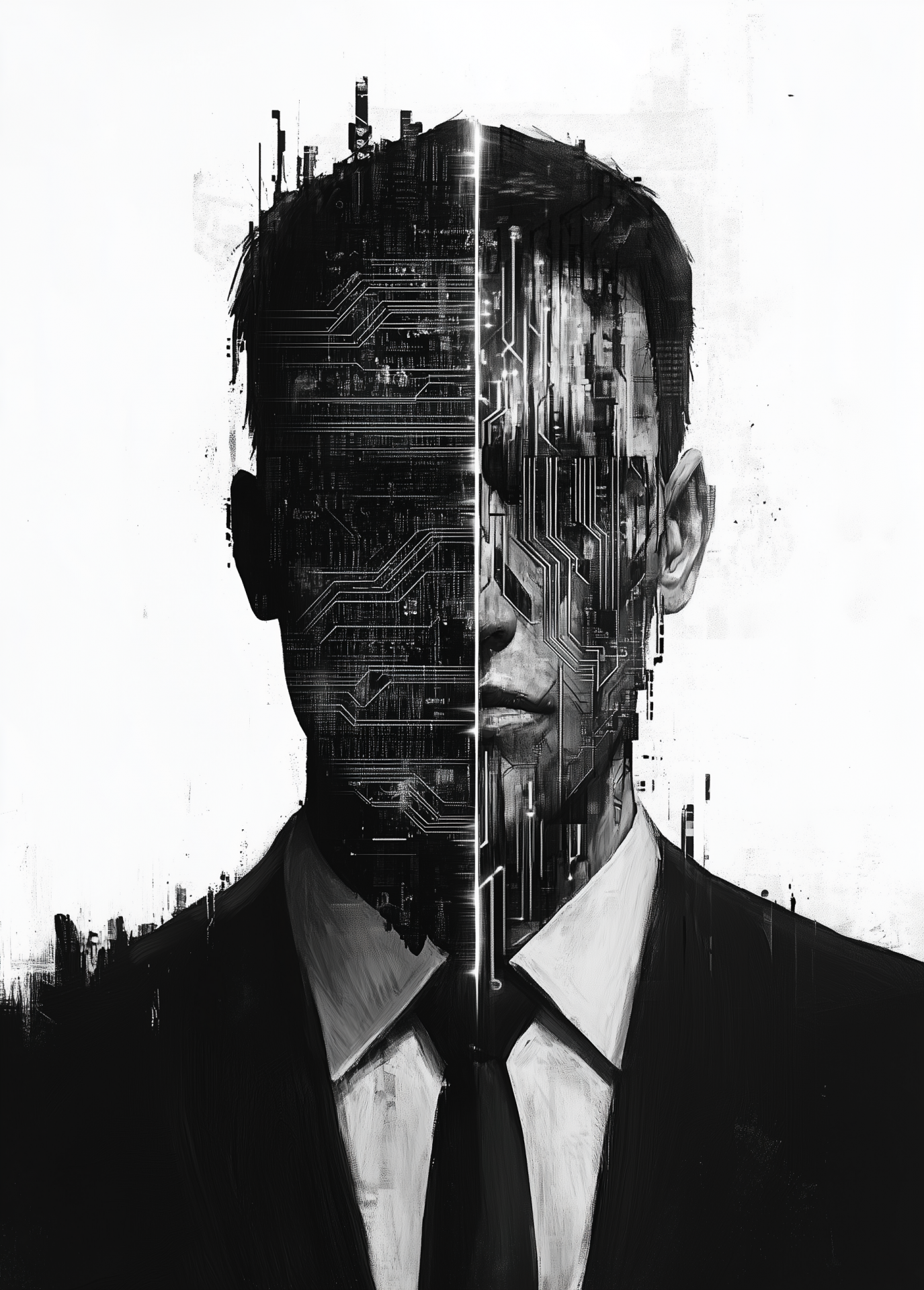 This image captures a striking contrast between a humanoid figure's digital circuitry and human-like appearance. The ink wash style adds a cinematic quality, with intricate textures and soft lighting creating an ethereal ambiance.