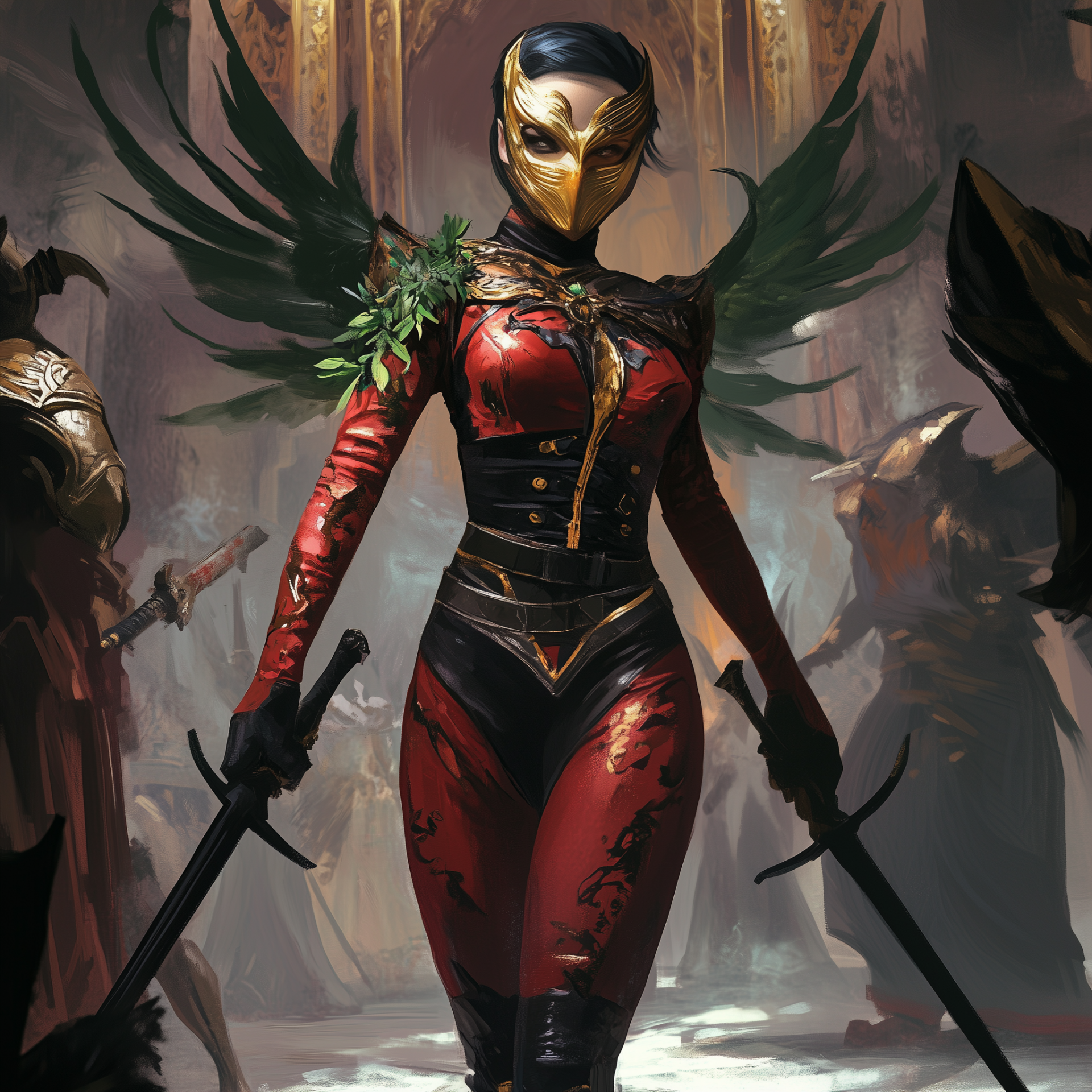 The image depicts a fierce woman adorned in a striking red and gold bodysuit, holding two ominous black daggers. Against the backdrop of a frozen temple, her golden angel mask adds an element of intrigue, while green plants intertwine with her attire, enhancing the ethereal theme.