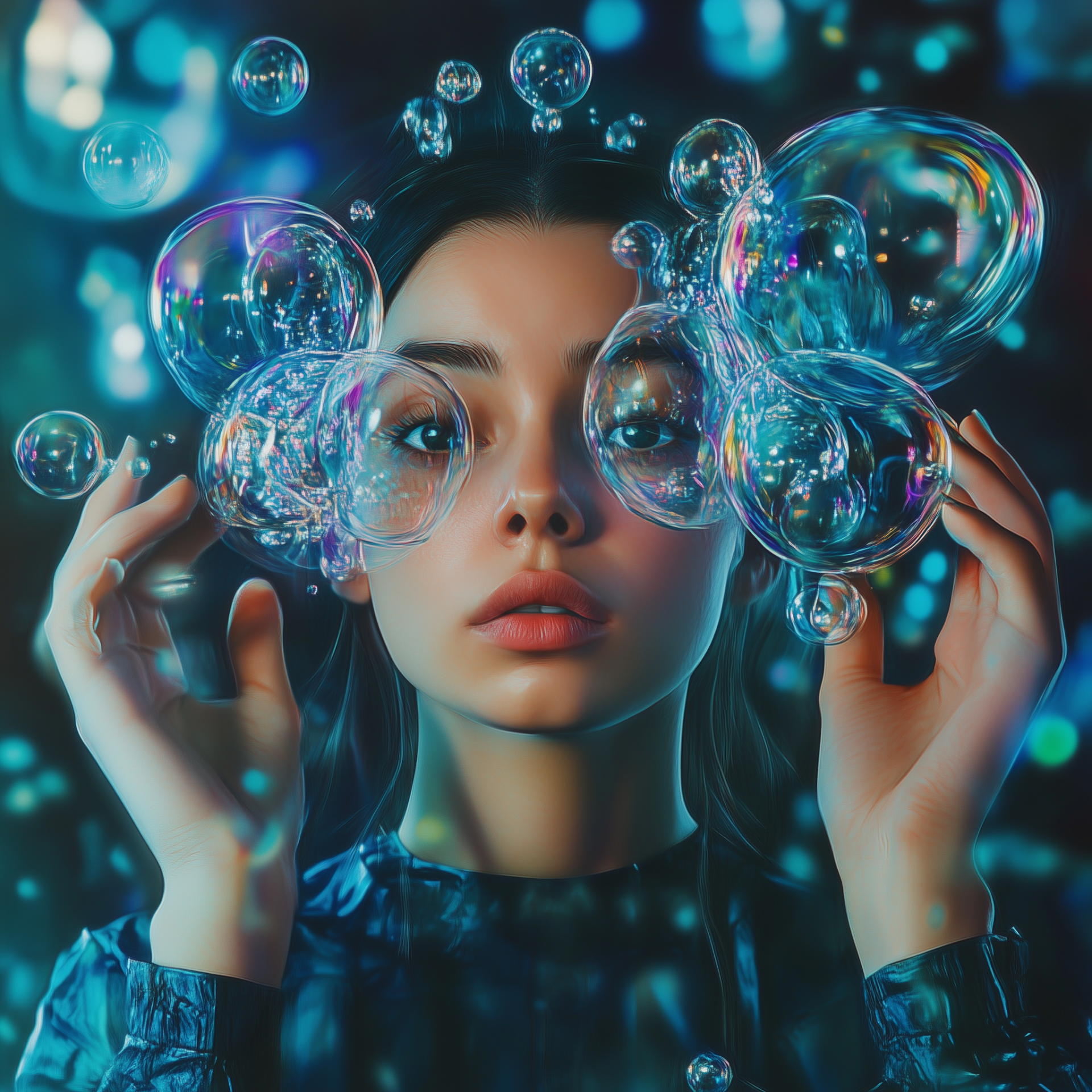 This hyperrealistic illustration portrays a woman surrounded by ethereal bubbles, each representing concepts of telepathy and artificial intelligence. The colors and textures create a surreal atmosphere, blending human emotion with advanced technology.