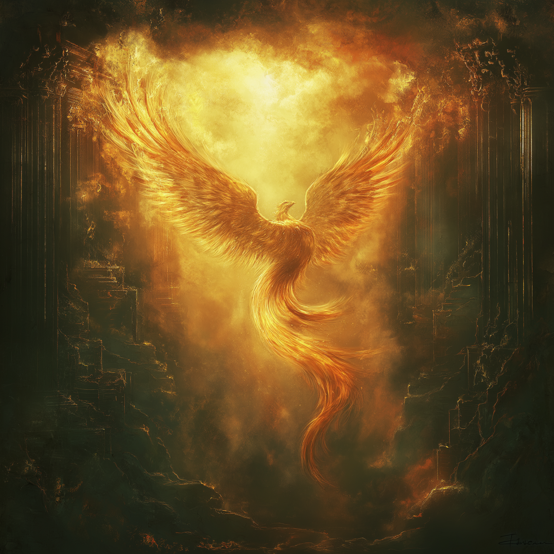 The image depicts a majestic phoenix emerging triumphantly from a bed of ashes, embodying the contrast between darkness and light. The style reflects the grandeur and intricate details characteristic of Renaissance paintings, evoking a sense of rebirth and hope.