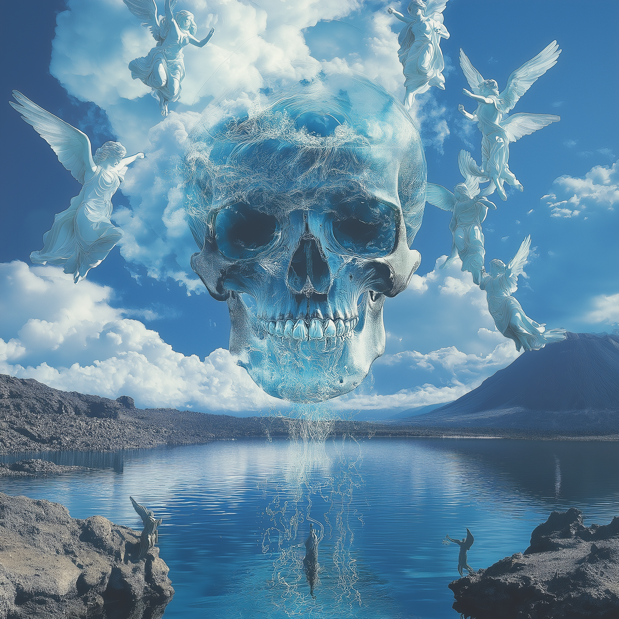 This surreal illustration depicts a skull crafted from water, delicately hovering over a fiery volcanic lake. Surrounding the scene are ethereal angels, each embodying a different virtue, adding to the dreamlike atmosphere.