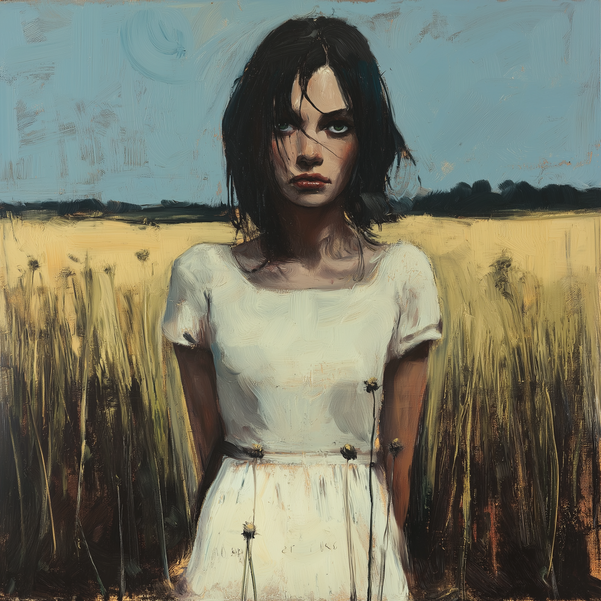 This image features a girl standing gracefully in a lush green field, capturing a serene moment. The artwork is characterized by soft colors and a dreamy ambiance, evoking a sense of tranquility and freedom.