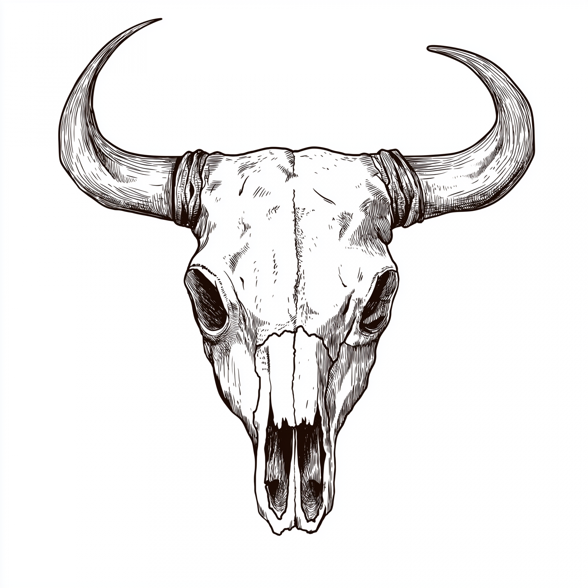 This illustration features a wild west cow skull rendered in a funky and artistic line drawing style. The bold lines and unique design evoke a sense of the rustic and adventurous spirit of the wild west.