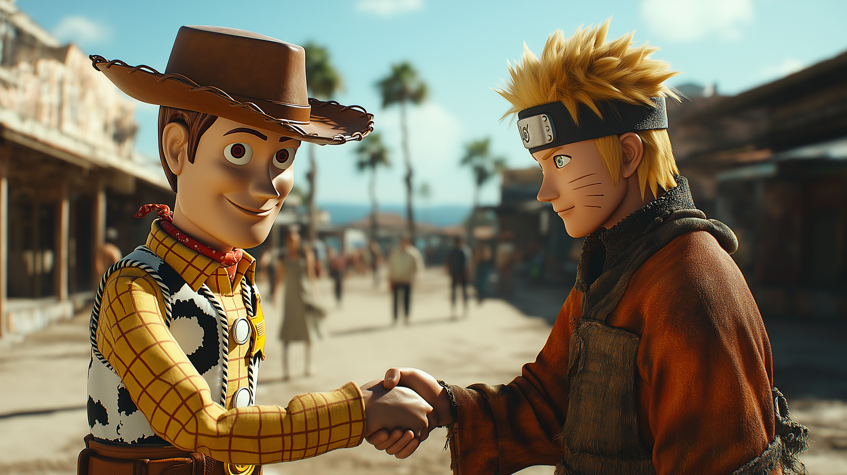 An illustration portraying a realistic interpretation of Woody from Toy Story and Naruto from Naruto, blending the animated characters into a lifelike appearance.