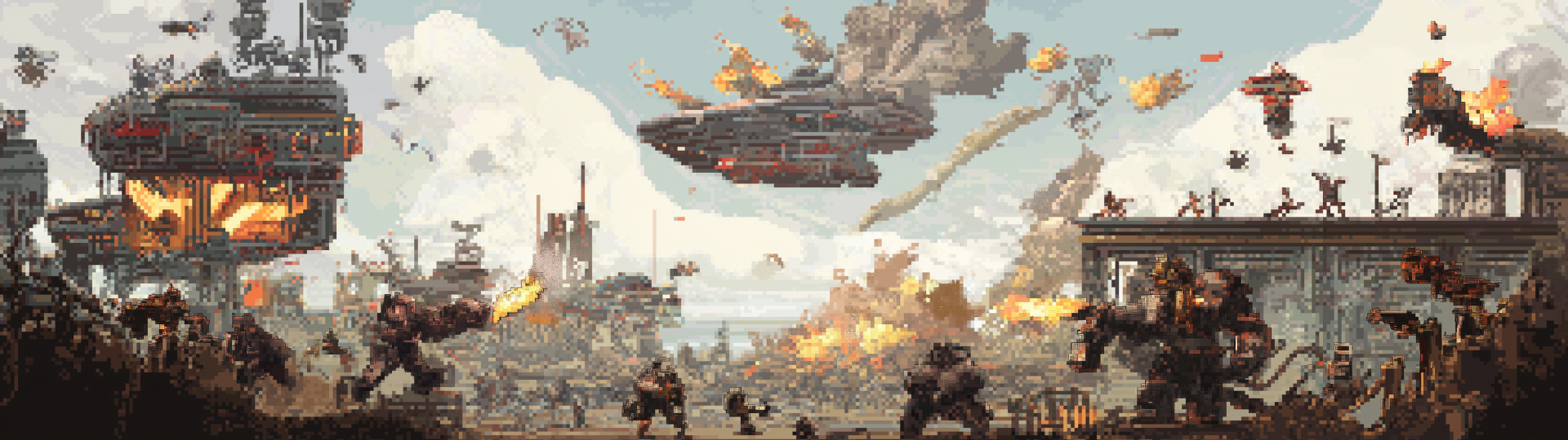 This pixel art mural vividly captures a large-scale battle scene filled with dynamic action and vibrant colors. The detailed style showcases various fantastical elements that create an engaging and immersive atmosphere.
