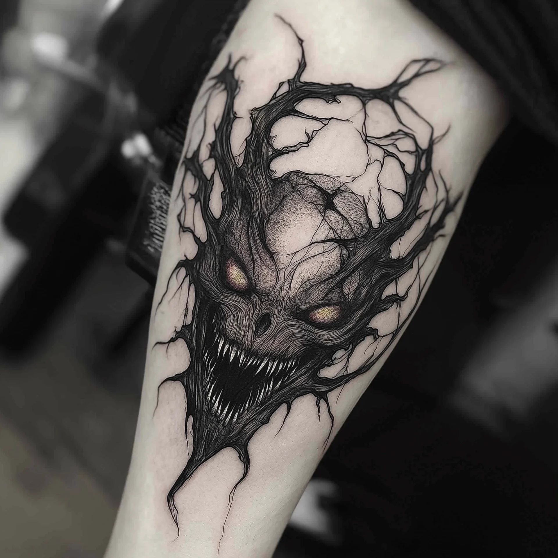 This image features a striking blackwork tattoo design characterized by intricate patterns and bold lines without any shading. The design exudes a sense of depth and artistry, presenting a captivating visual appeal.