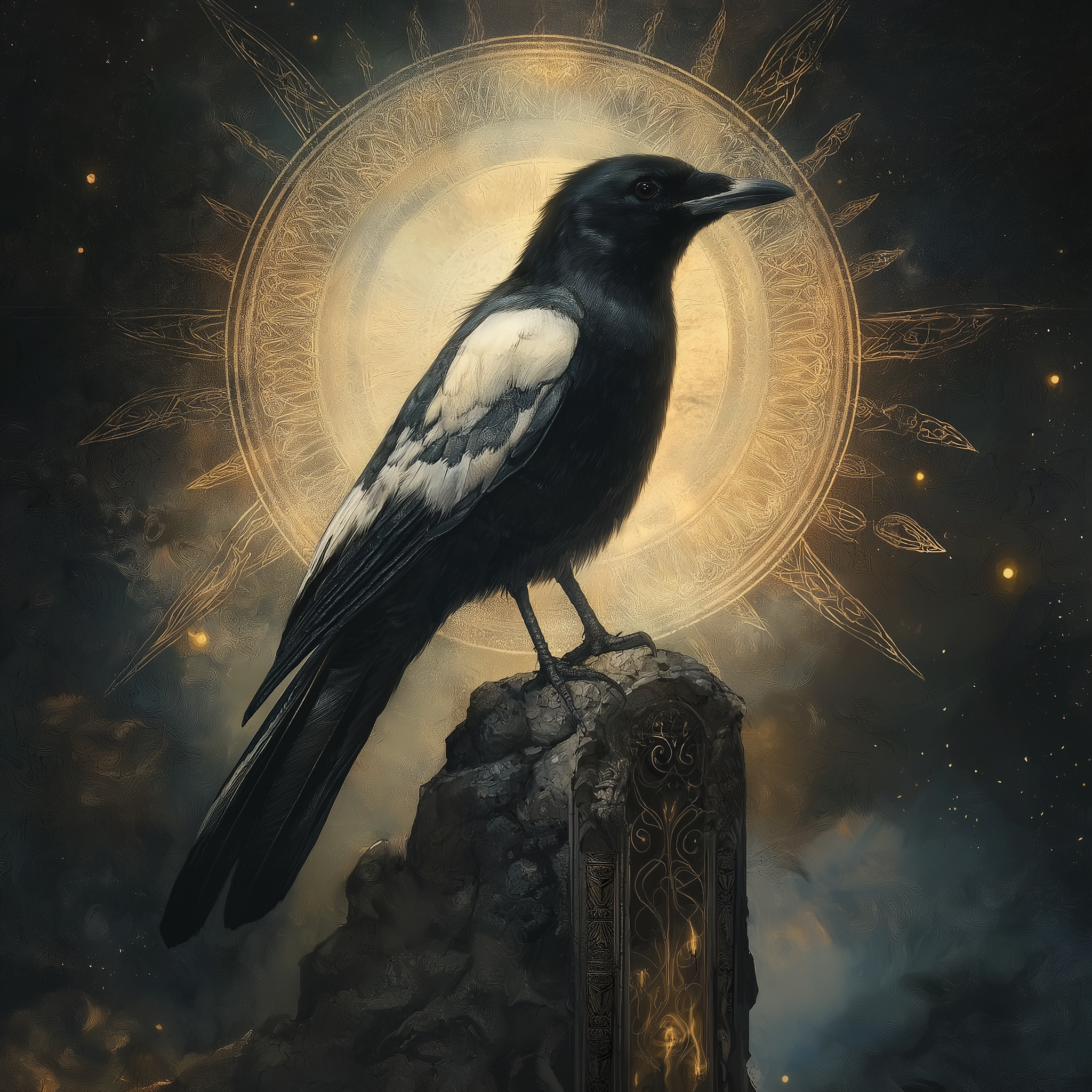 The image features a beautifully crafted deity resembling a magpie, intricately detailed with enchanting patterns. Its glossy feathers shimmer, evoking a sense of magical allure and otherworldliness.