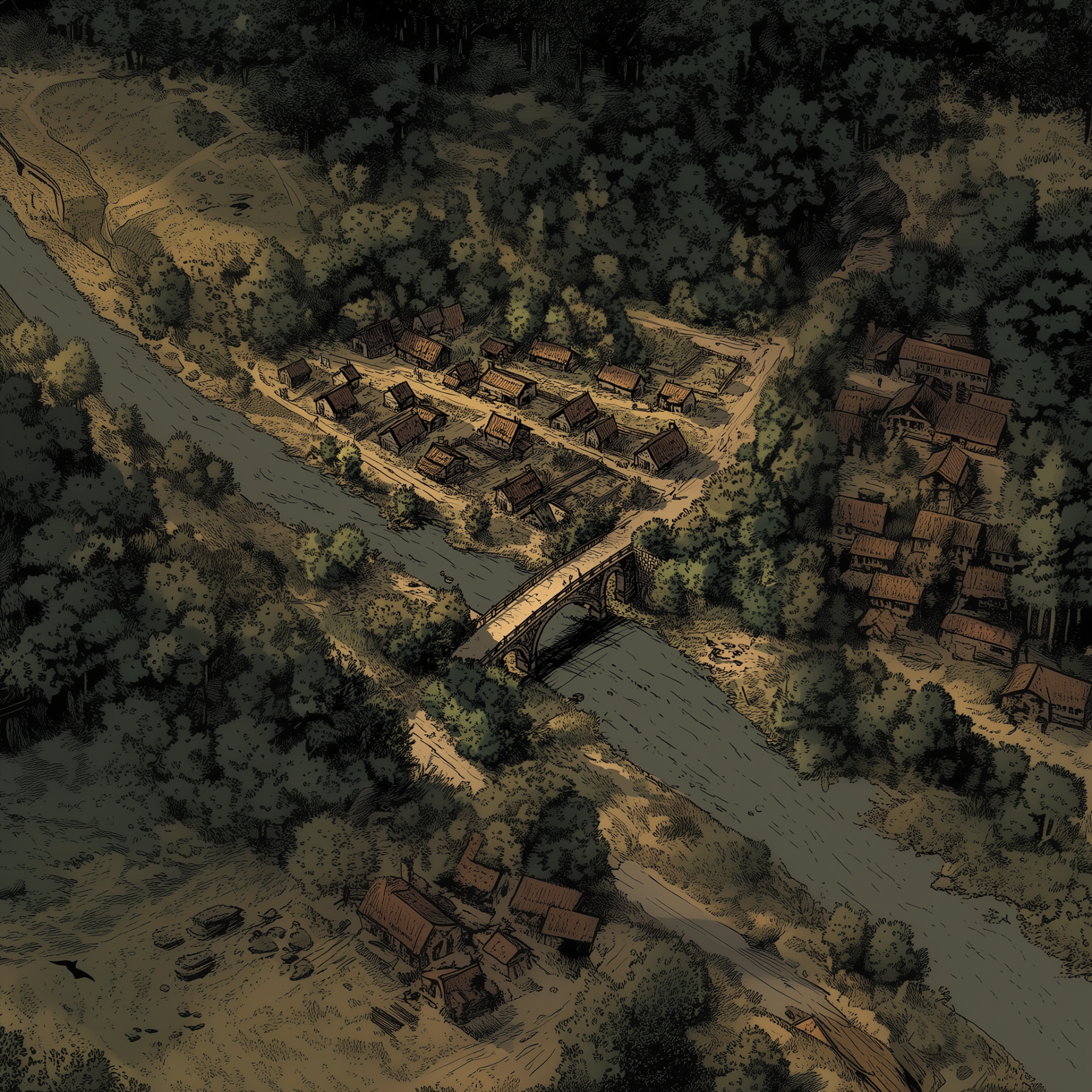 This illustration presents an overhead view of a small Iron Age village surrounded by hills and positioned beside a river. The artwork features bold lines and cinematic lighting with deep shadows, creating a striking and dramatic atmosphere.