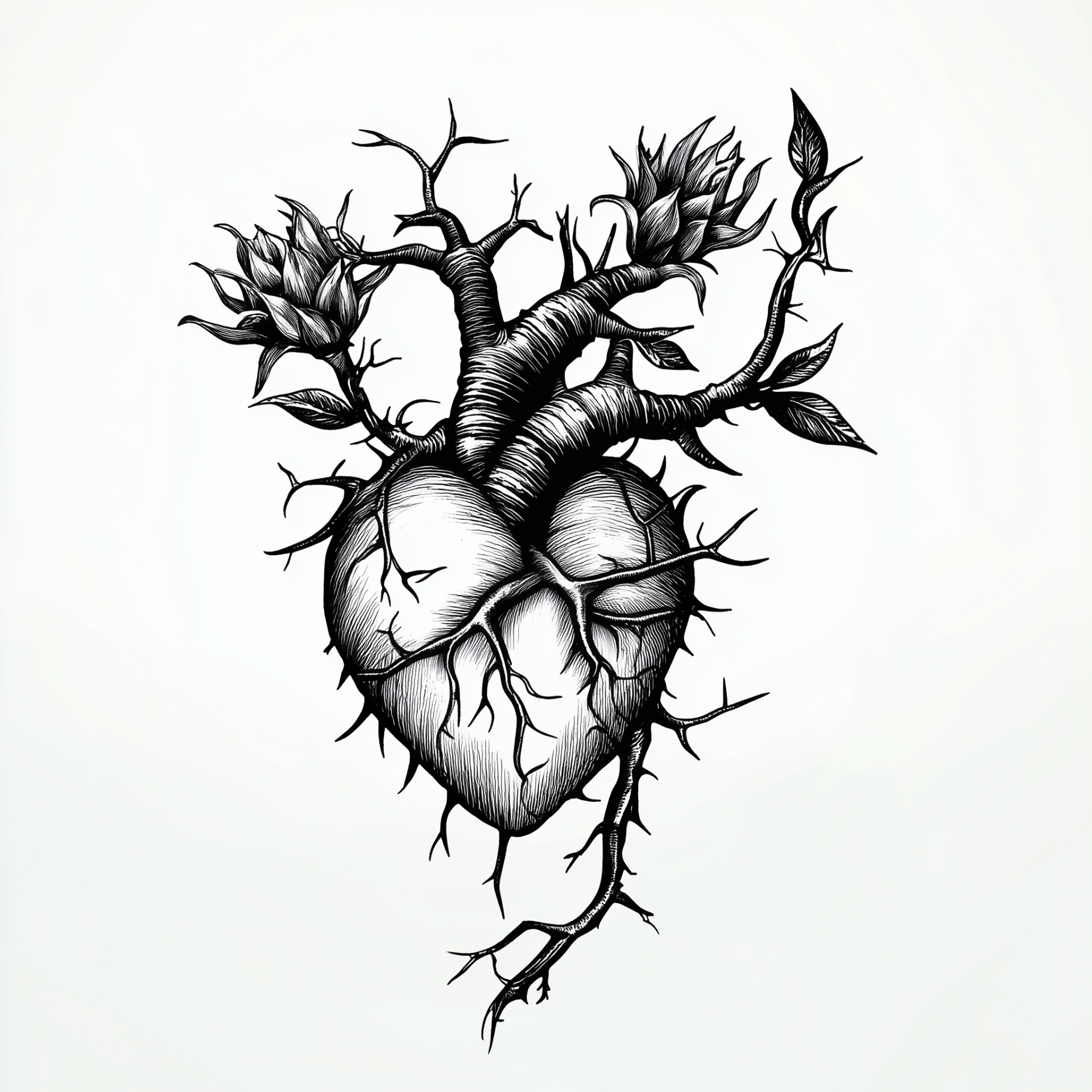 This illustration features a striking black and white depiction of a flowering weed with thorns intricately wrapped around a human heart. The minimalist style emphasizes the contrast between the delicate flowers and the rugged thorns against a clean white background.