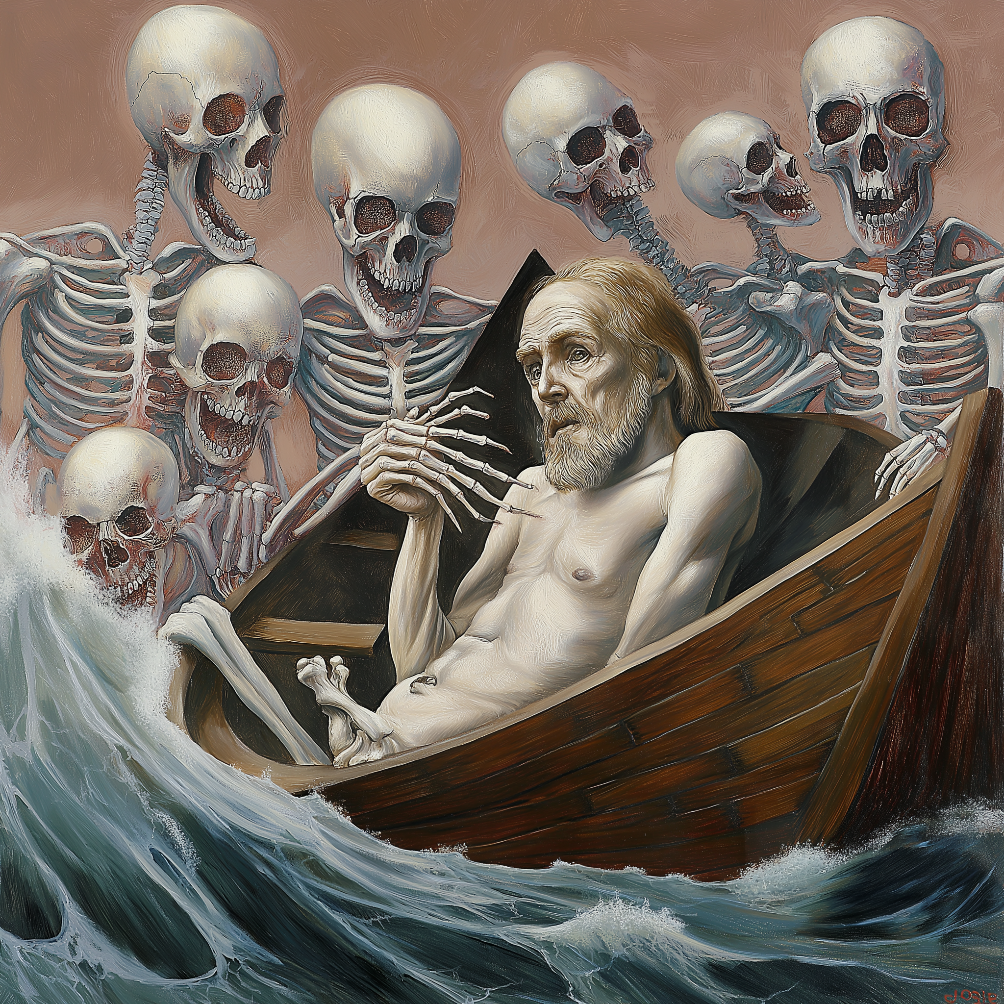 The illustration depicts an aged figure that embodies a sense of humility and sorrow. The style is emotive, using muted tones to evoke a reflective and contemplative atmosphere.