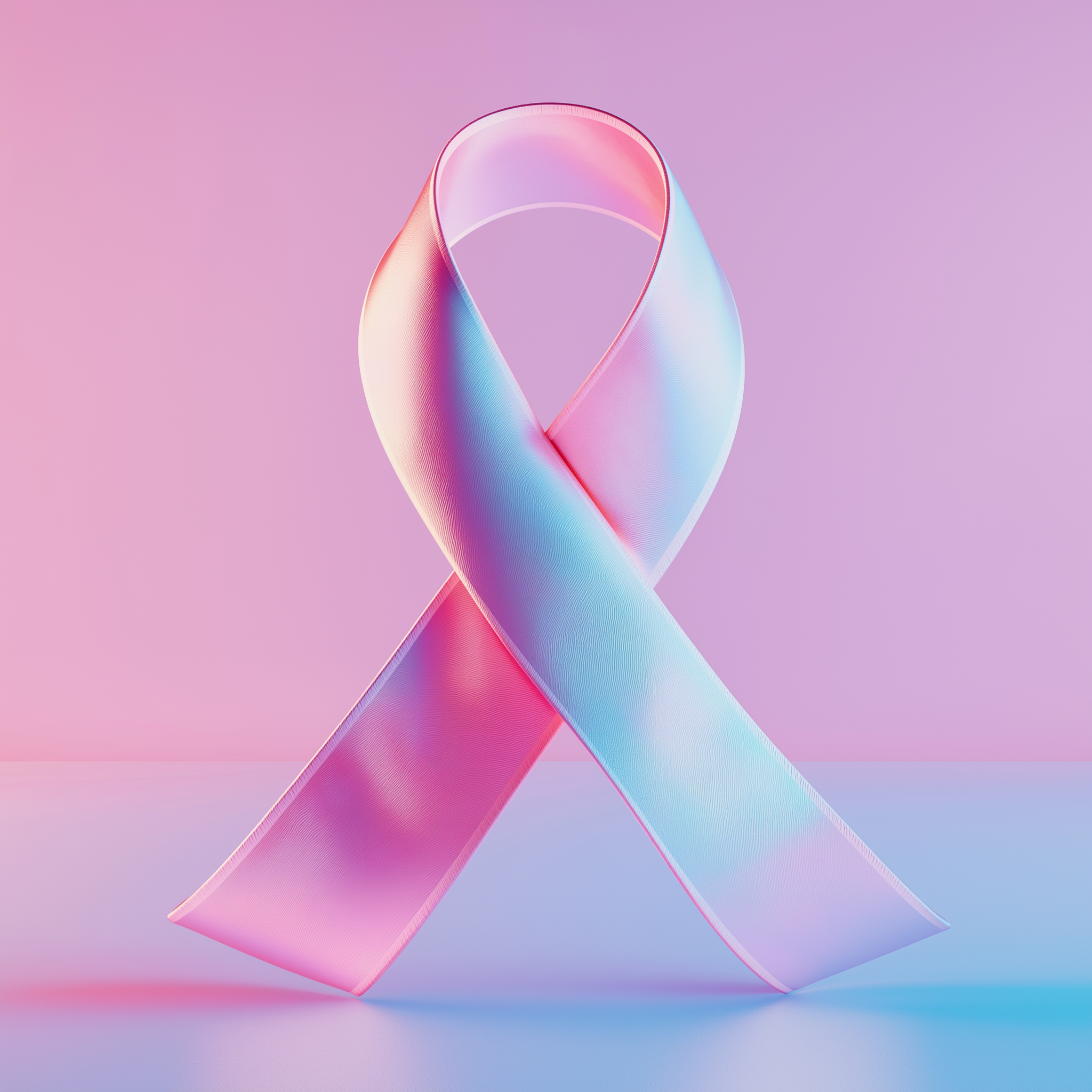 This image features a glossy 3D render of a pink ribbon, elegantly shaped and illuminated to create a soft reflection. The vibrant pink color evokes feelings of hope and support, embodying the essence of awareness and solidarity.