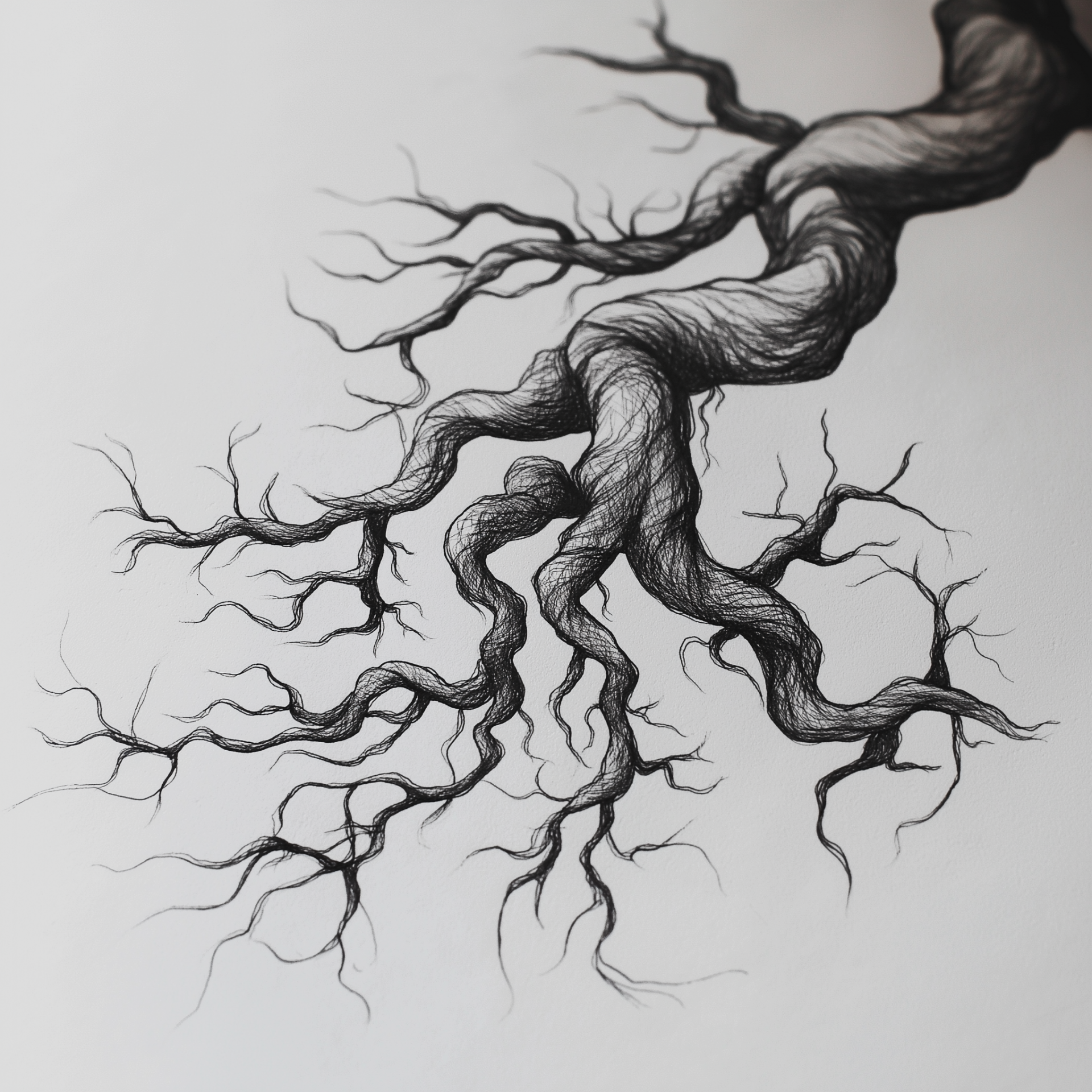 This image showcases a detailed close-up of a tattoo design featuring intertwined roots. The black and white illustration highlights the intricate patterns and textures of the roots, creating a striking visual impact.