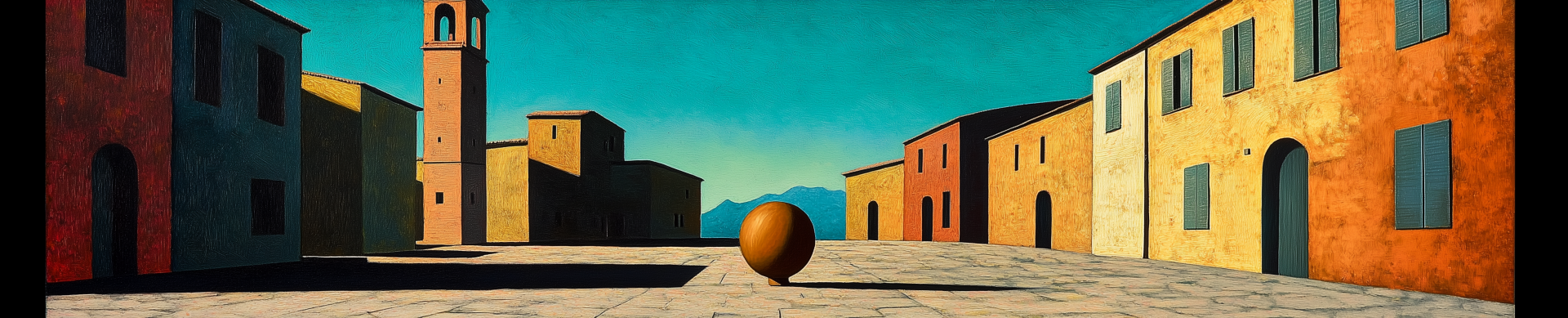 The image features a surreal landscape with a stark square structure that casts long shadows, evoking feelings of mystery and contemplation. The color palette includes muted tones, creating a dreamlike atmosphere reminiscent of early 20th-century surrealism.