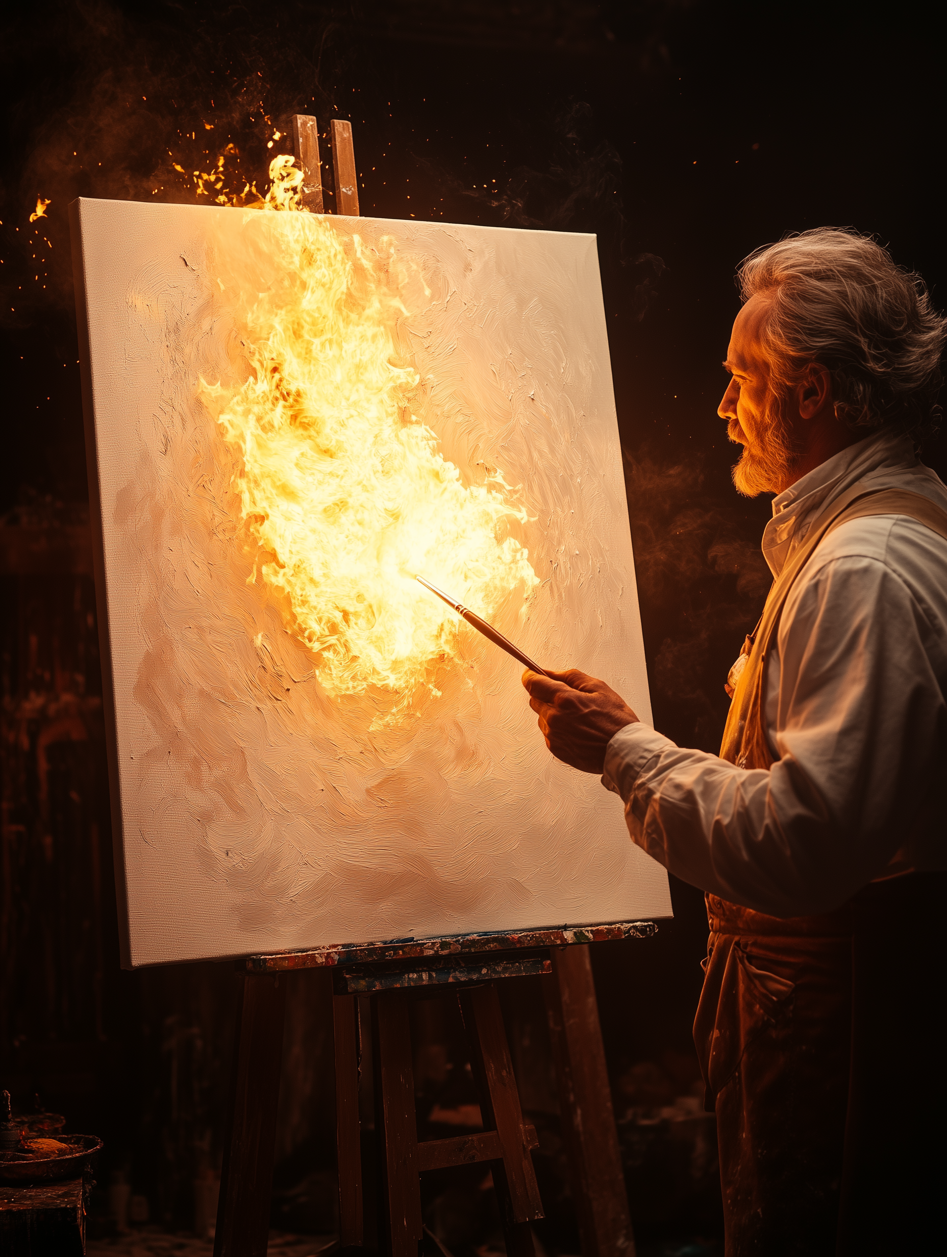 The image captures a surreal scene of a man who is painting with a brush engulfed in flames. The white canvas serves as a stark contrast to the vibrant fire, creating a striking visual impact.