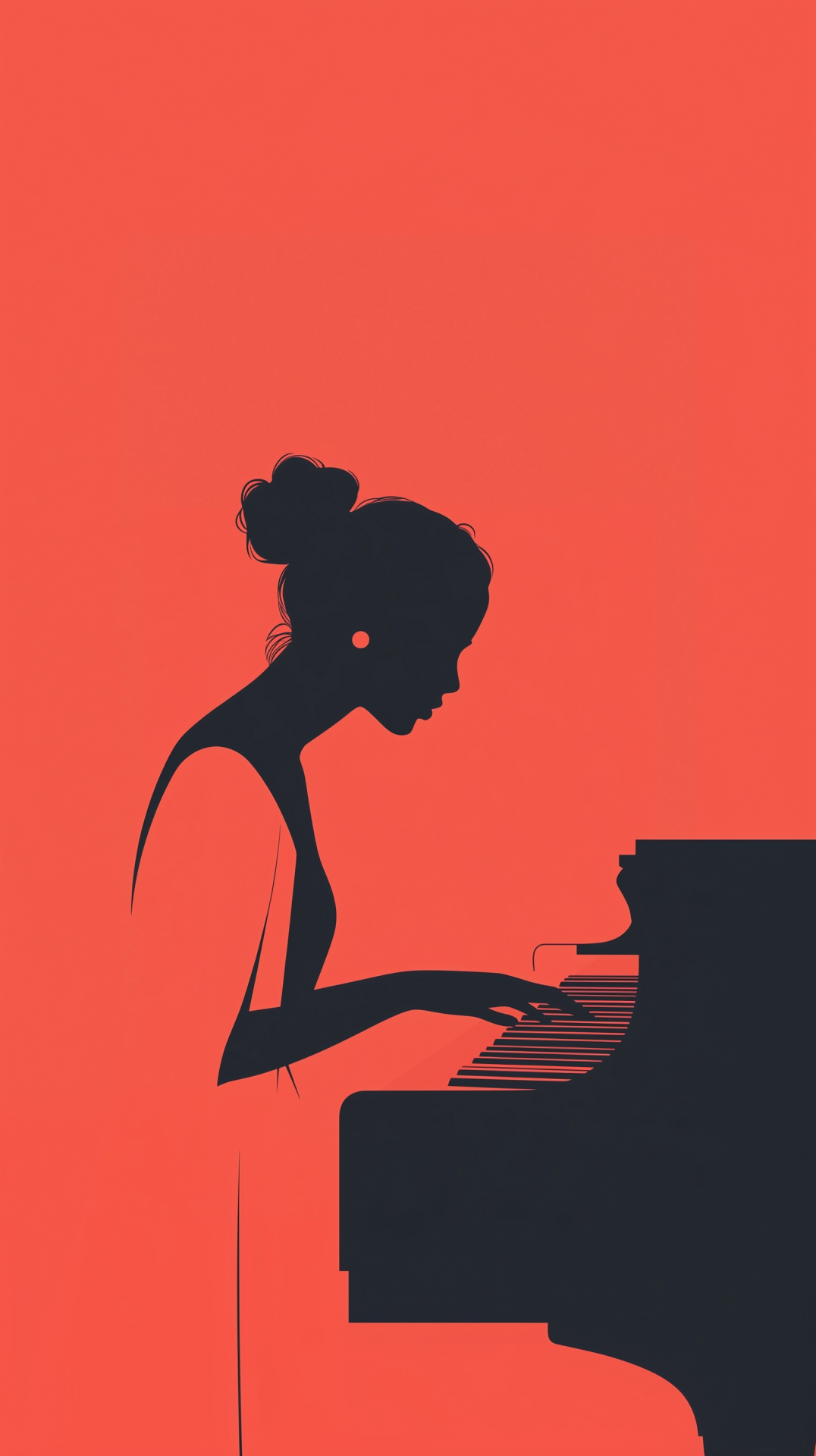 The image features the silhouette of a woman playing the piano against a gradient pink and coral background. This composition embraces a mid-century poster style, highlighted by simple vector design and risography aesthetics.