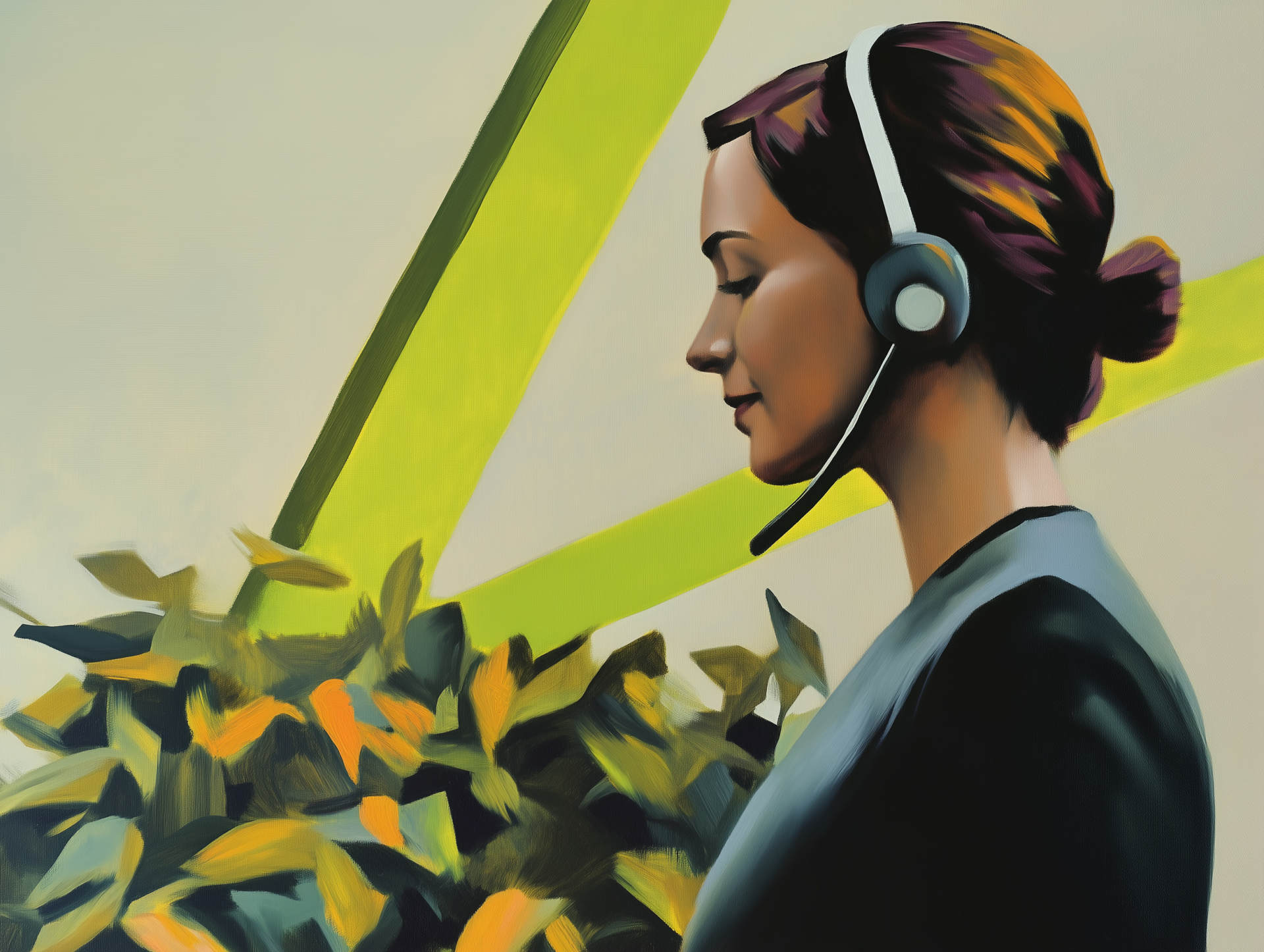 This illustration features a friendly receptionist wearing a headset amidst a warm and inviting office environment. The use of vibrant colors and expressionist style creates a feeling of happiness and comfort, enhanced by the presence of plants and soft lighting.