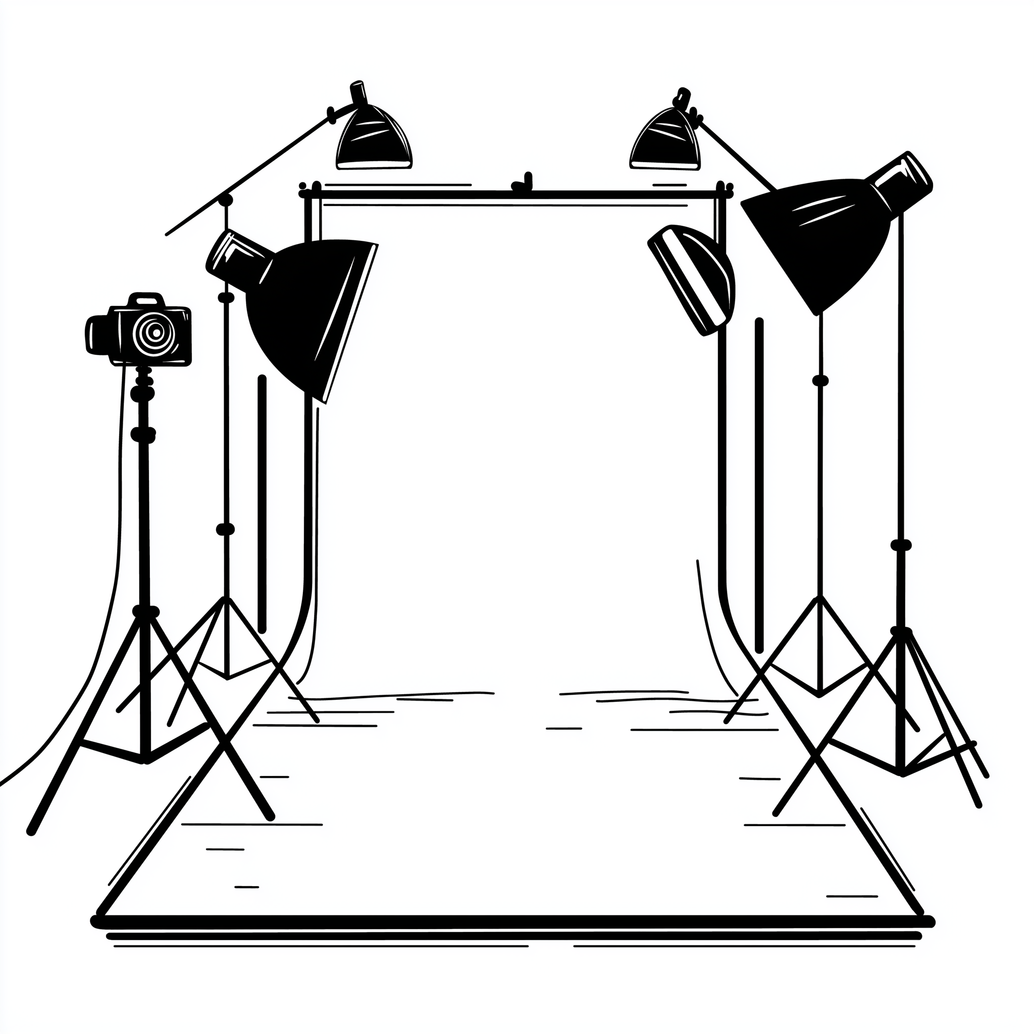 An elegant and sleek black and white outline illustration of a photo studio icon. The design is simple yet sophisticated, capturing the essence of photography.