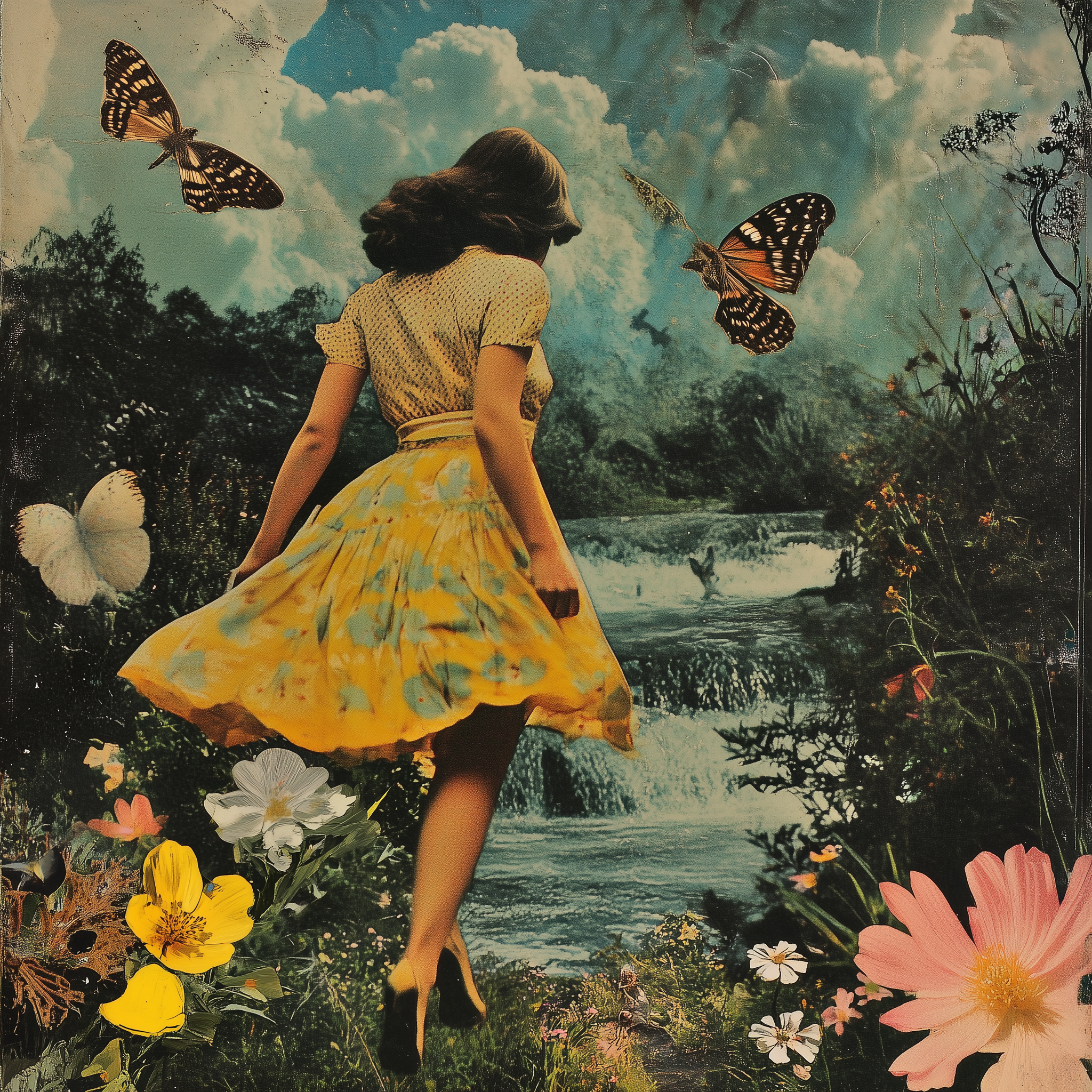 A vintage ephemera collage depicting a stormy scene, with various old paper elements layered together. The atmospheric and textured composition creates a dramatic and nostalgic feel.