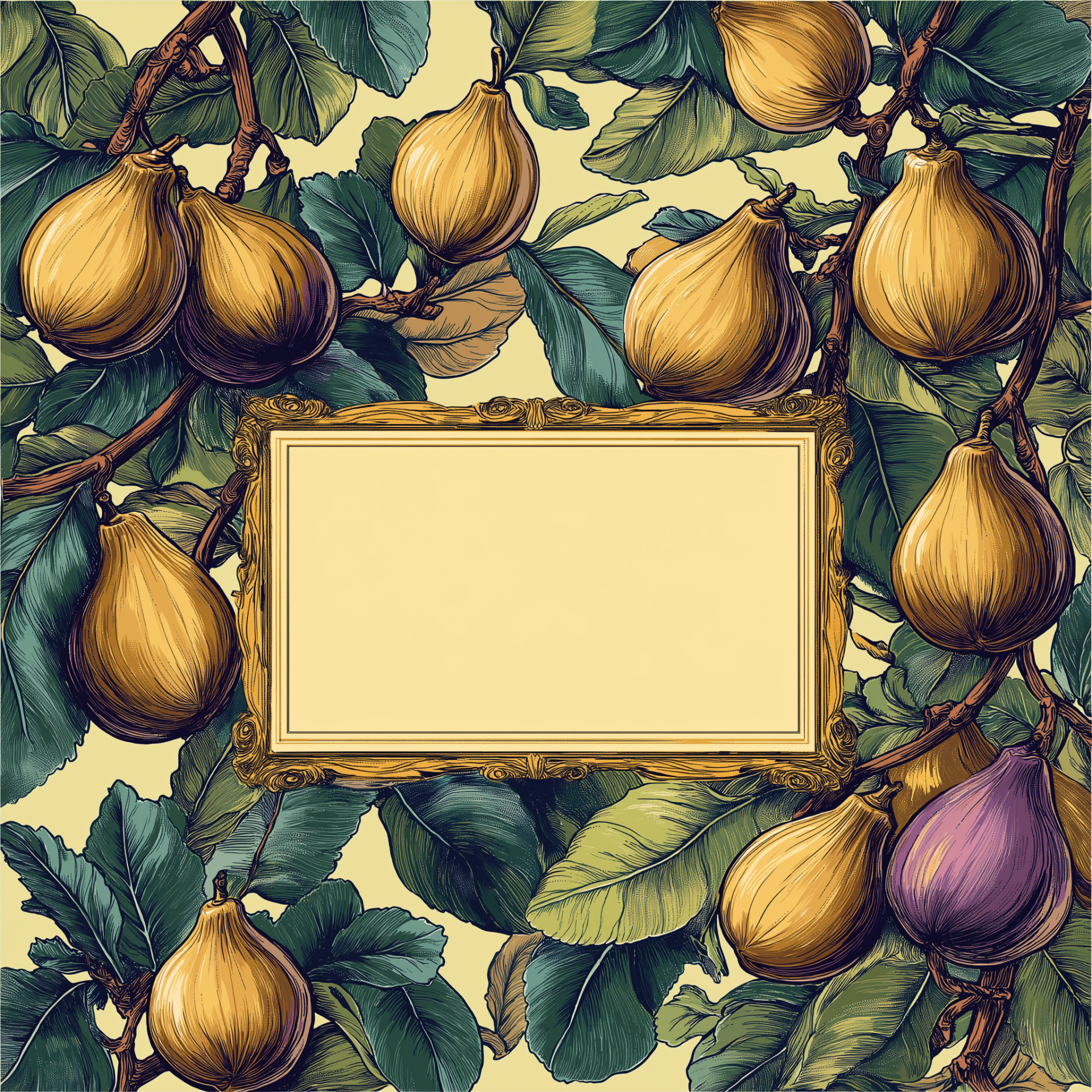 This image features an artistic business card with a central rectangular text box. The design is embellished with whimsical golden figs, vibrant vines, and leaves, creating an elegant and bold aesthetic.