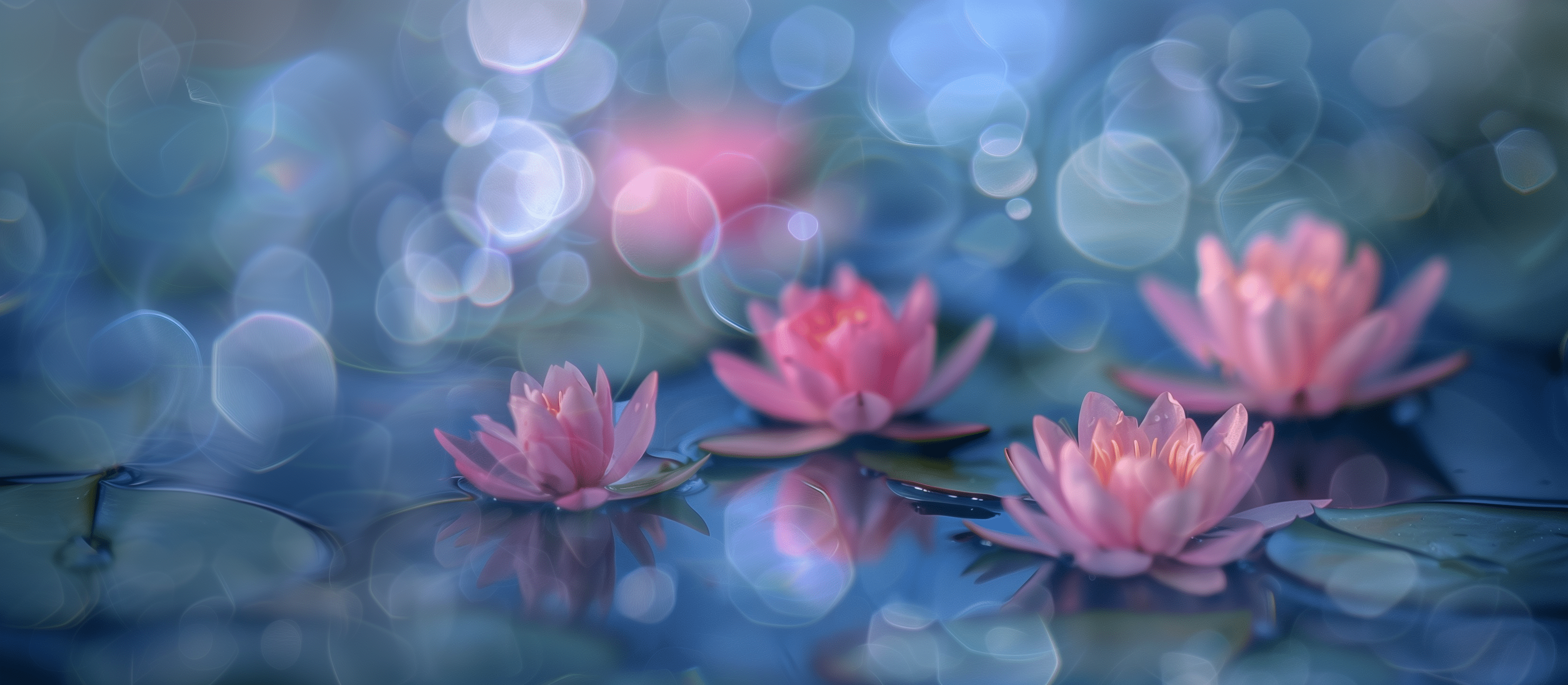 An abstract and dreamy interpretation of water lilies in shades of blues, greens, and pinks, with a soft focus and short focal length, resembling the impressionistic style of Claude Monet.
