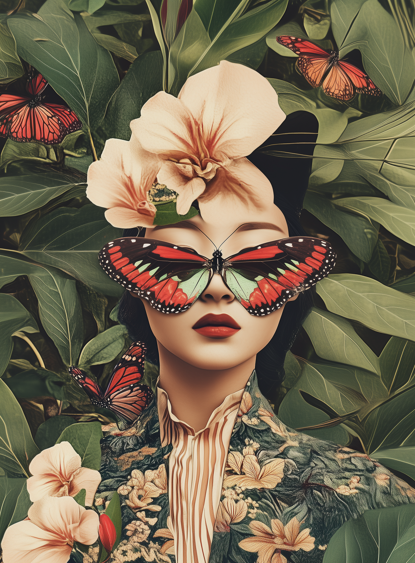 This image features a surreal collage of a woman adorned with a vibrant flower and butterfly mask. The lush green leaves in the background create a harmonious and enchanting atmosphere.