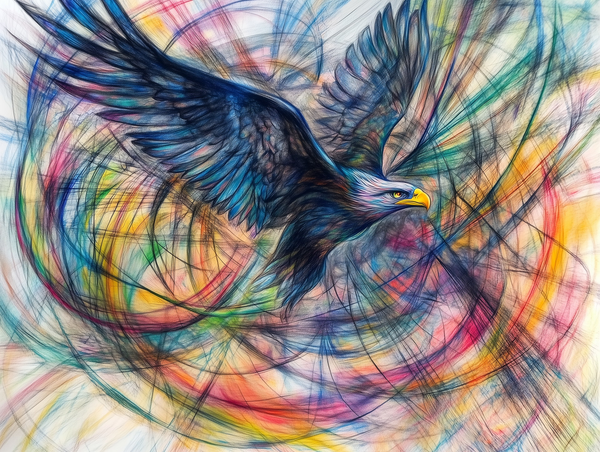 The illustration features intricate and vivid charcoal lines creating a mesmerizing fractal pattern that follows the Fibonacci sequence. An eagle is depicted diving gracefully from outer space, adding a dynamic element to the colorful design.