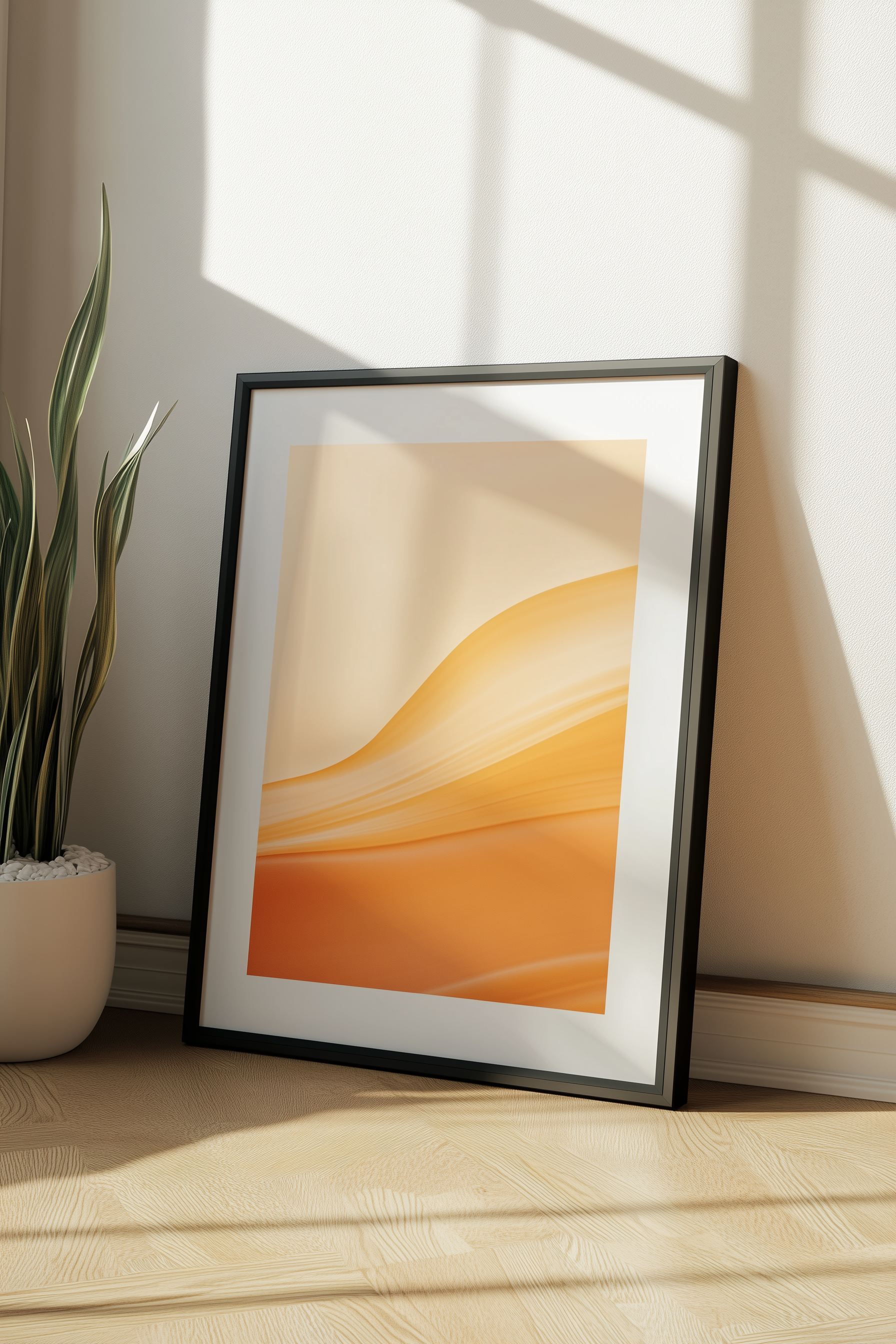 This image features a horizontal framed print mockup, elegantly leaning against a clean wall. The overall style is bright and modern, conveying a sense of minimalism and freshness.