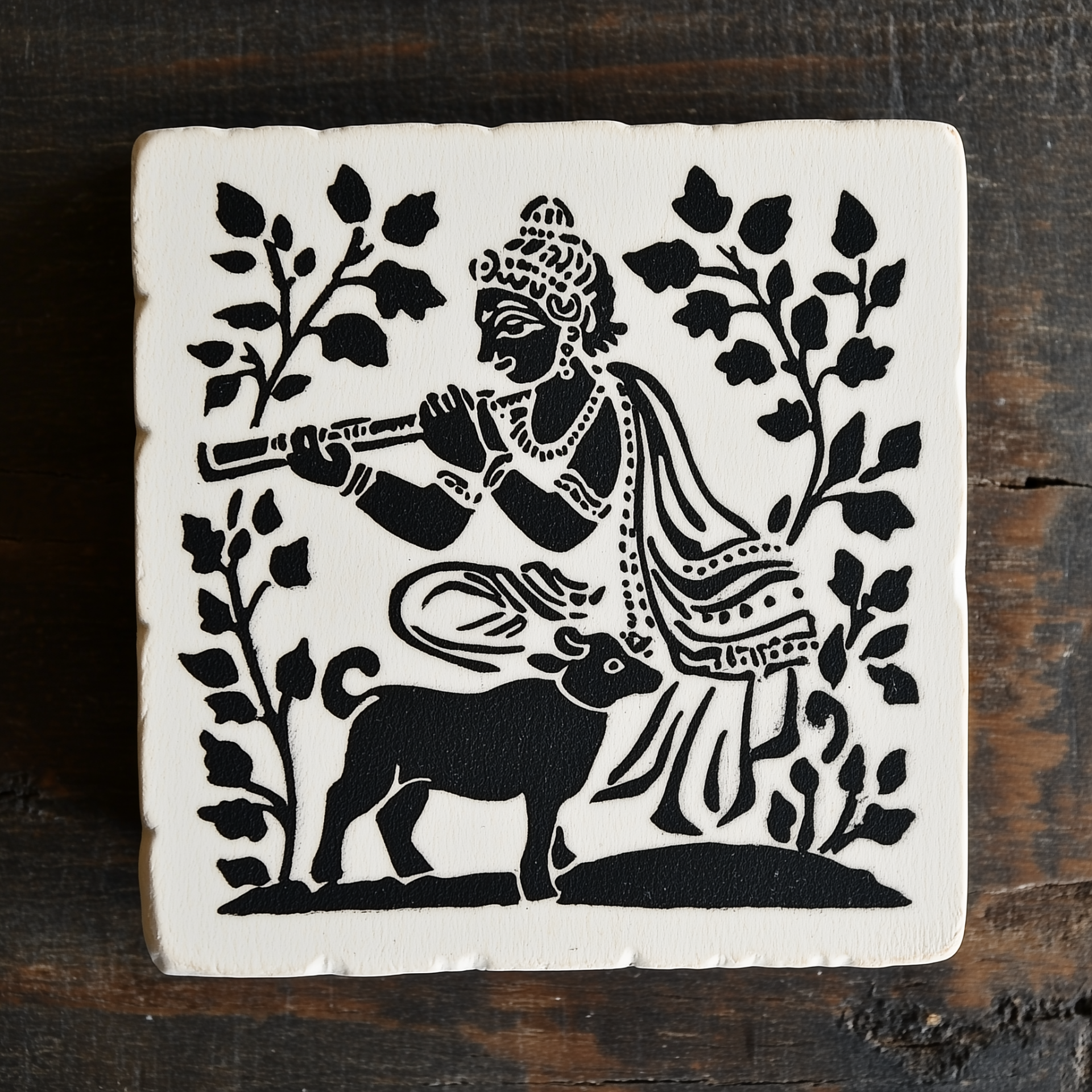 This illustration features a block print design of Krishna playing his flute next to a calf. The artwork is done in black ink on a white solid background, creating a striking contrast and highlighting the intricate details.