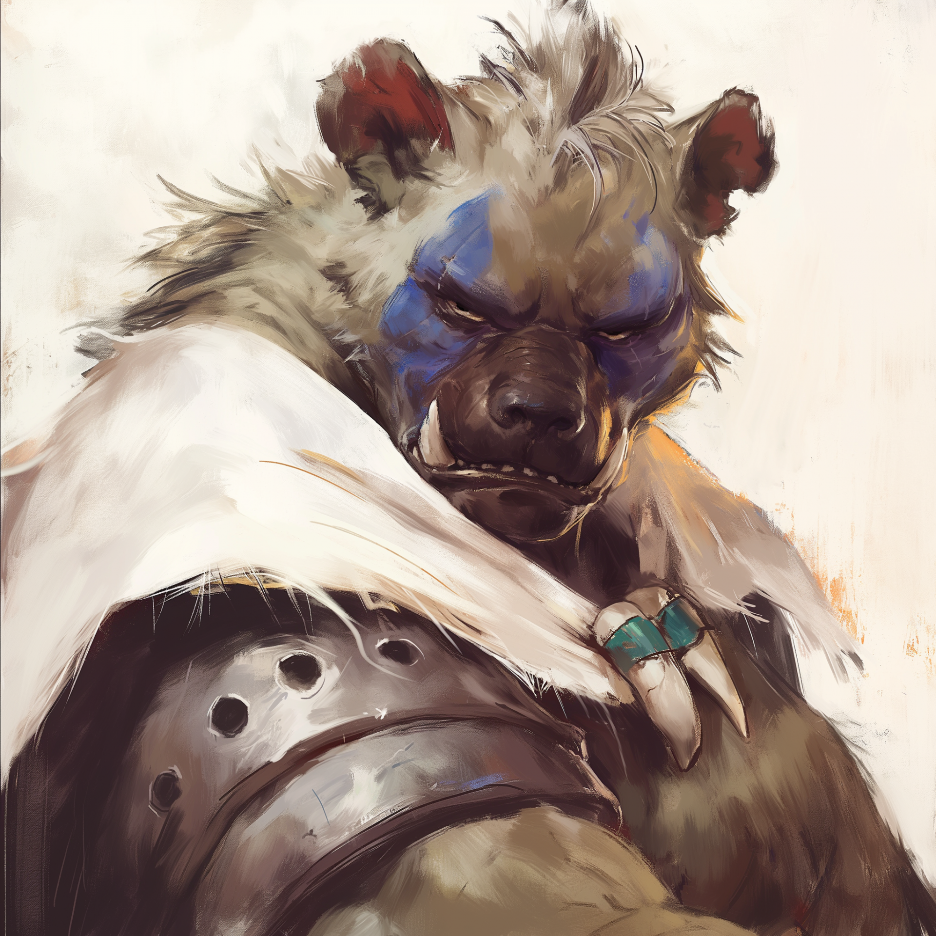 This illustration features a melancholy old gnoll with sad eyes, encapsulating a sense of loss and wisdom. The character is adorned in barbarian armor with a dramatic white cloak, set against a dark, textured background that enhances the overall cinematic effect.