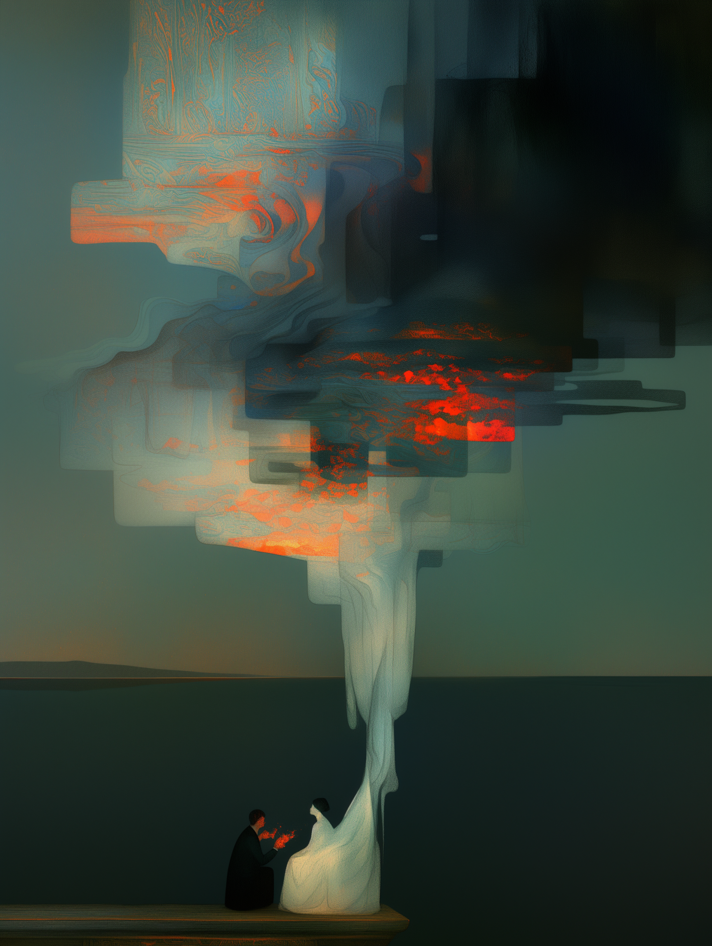 This illustration captures the emotional moment of lovers parting ways, with vibrant colors swirling in the background. The scene is enveloped in smoke and fog, enhancing the dramatic atmosphere of their farewell.