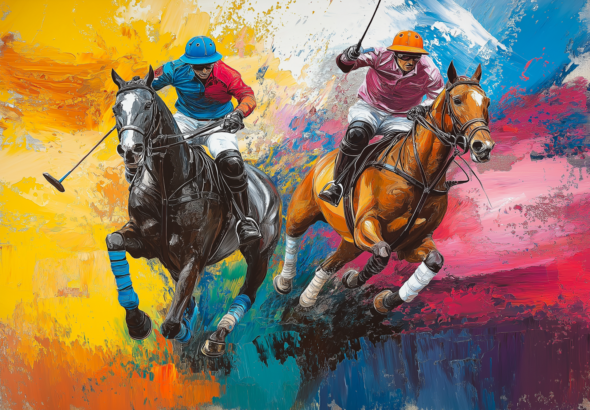 The image features an abstract depiction of two polo players engaged in action against a vibrant, colorful backdrop. Bold brush strokes and a mix of watercolor and oil techniques create a lively and expressive atmosphere.