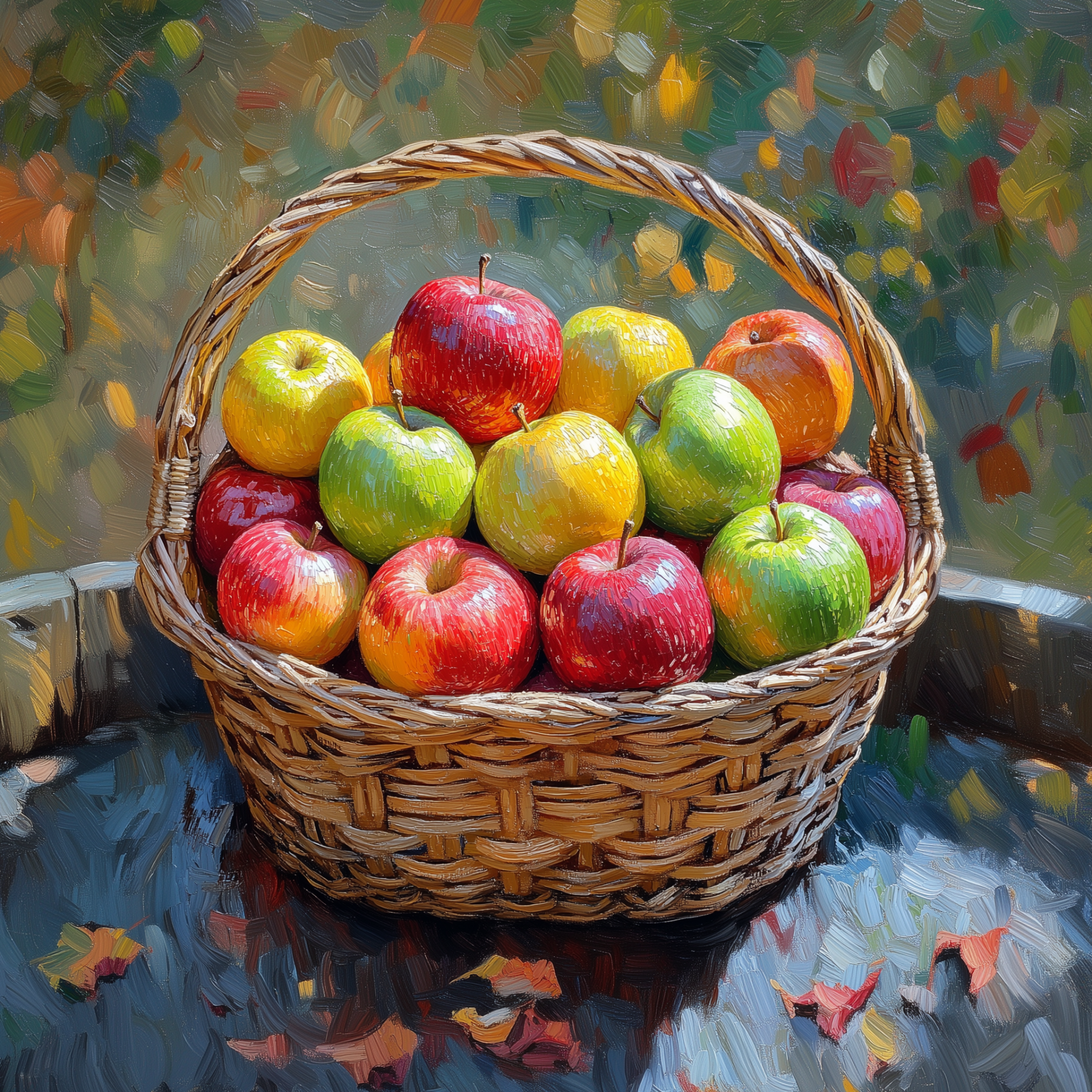 This illustration showcases a vibrant, textured depiction of apples arranged in a basket. The swirling brush strokes and bold colors evoke a sense of energy and emotion reminiscent of Van Gogh's artwork.