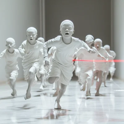 This image captures a captivating interior filled with an art installation resembling a weeping willow tree made of black beads. The shimmering strands create an immersive atmosphere with soft lighting and intricate shadows, evoking a sense of tranquility and wonder.