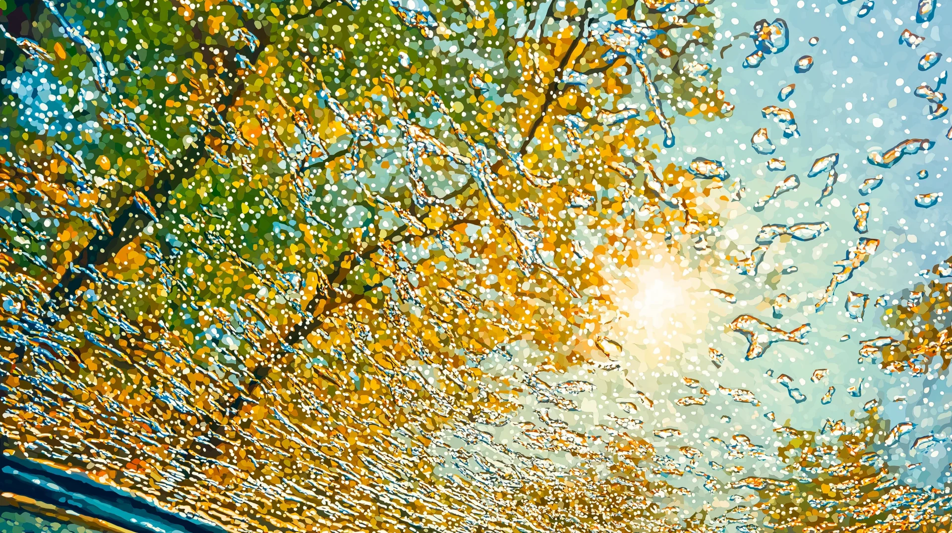 This image depicts a soft and vibrant impressionist landscape with lush greenery and a serene water body. The brushstrokes create a dreamlike atmosphere, evoking feelings of tranquility and awe in nature's beauty.