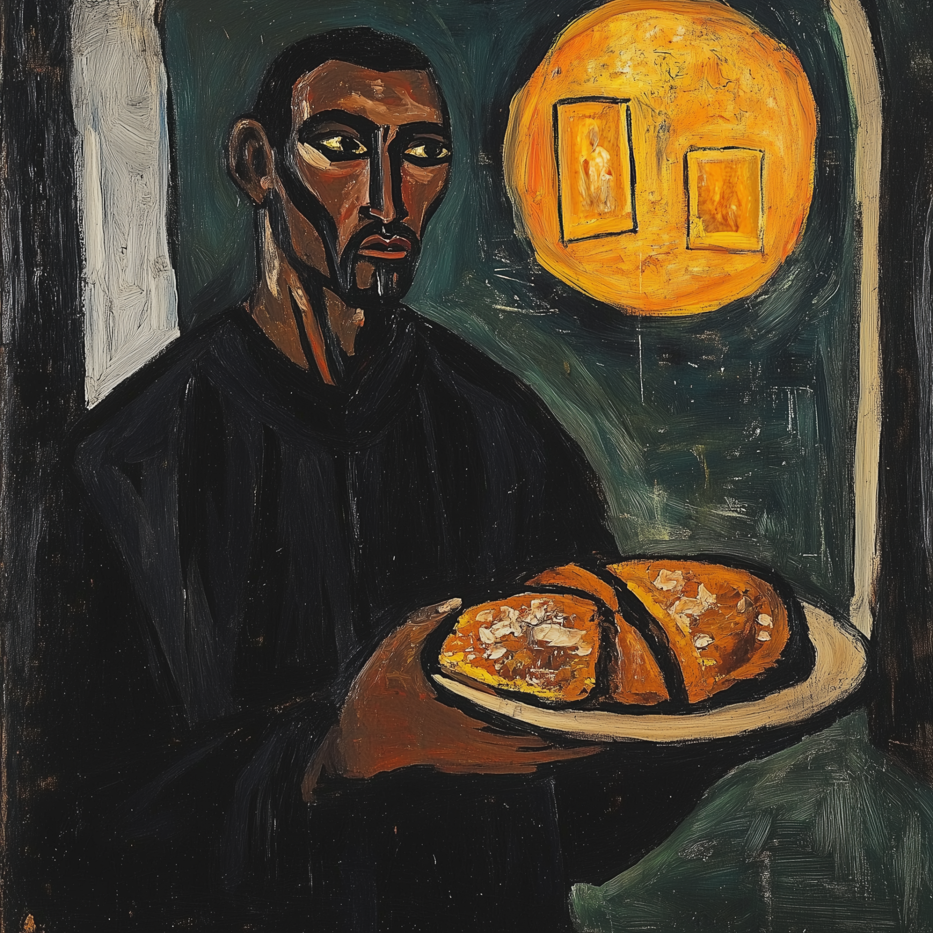This illustration depicts a priest in a vulnerable moment as he discreetly reaches for bread within the church. The artwork conveys a sense of moral ambiguity and intrigue, drawing viewers into the emotional conflict experienced by the character.