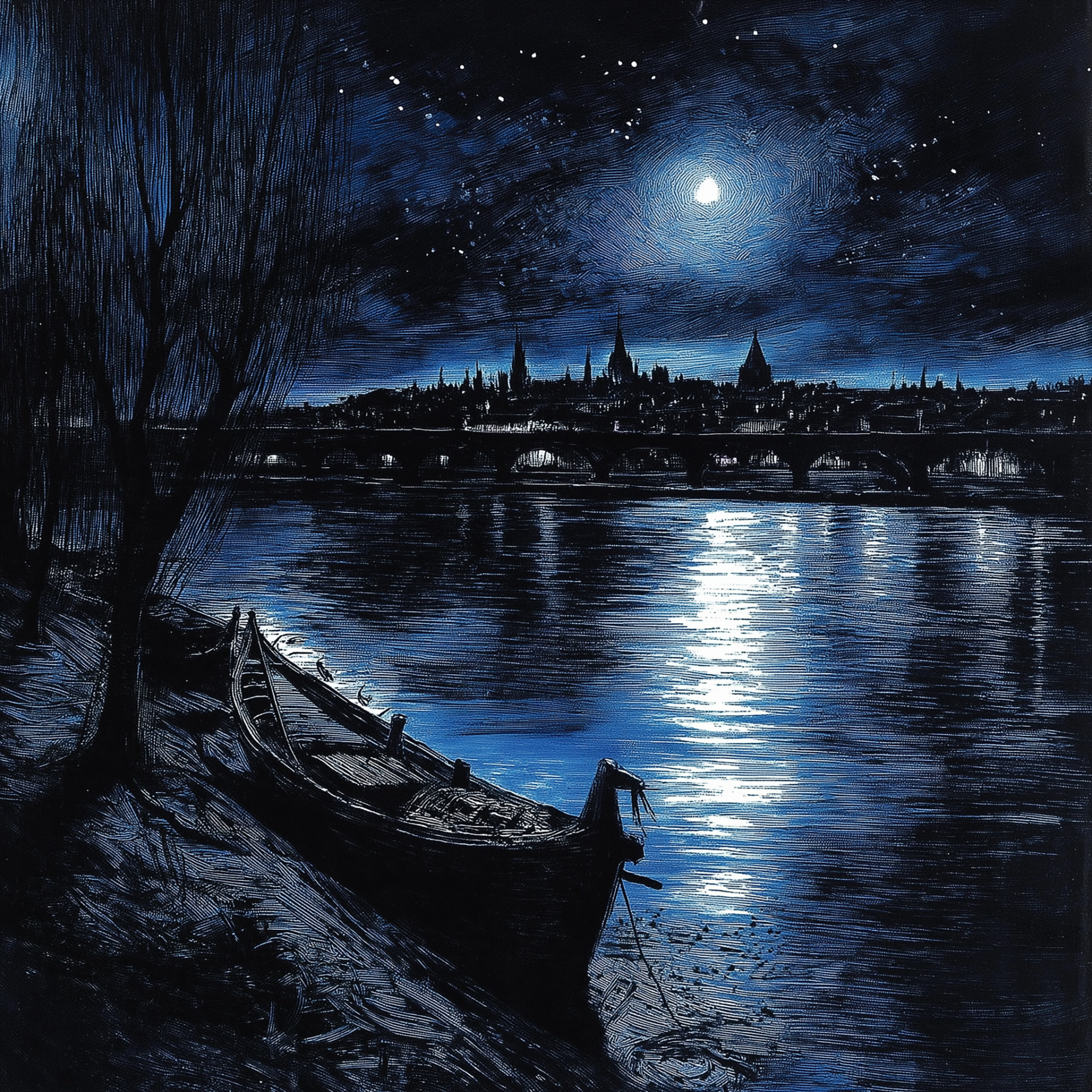 This artwork captures a serene night scene filled with shimmering stars above a calm river, reflecting the light of the celestial bodies. The brushstrokes create a swirling effect that imparts a sense of movement and emotion to the tranquil landscape.