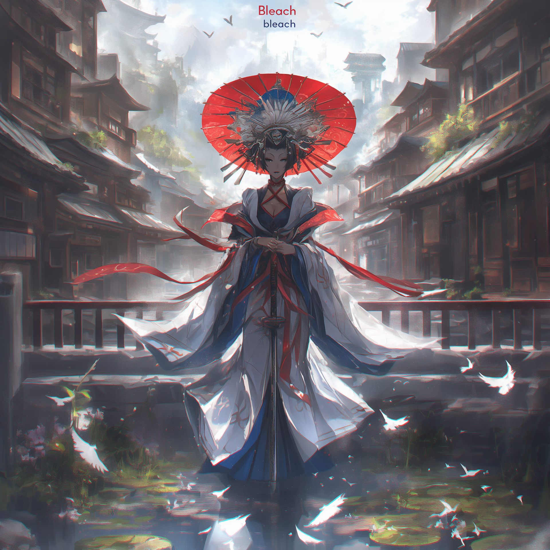 The image features a female figure dressed in a Shinigami Captain's garment, blending traditional Japanese and anime styles. Surrounded by lush feudal Japanese architecture, the scene is filled with atmospheric lighting, creating a cinematic effect.