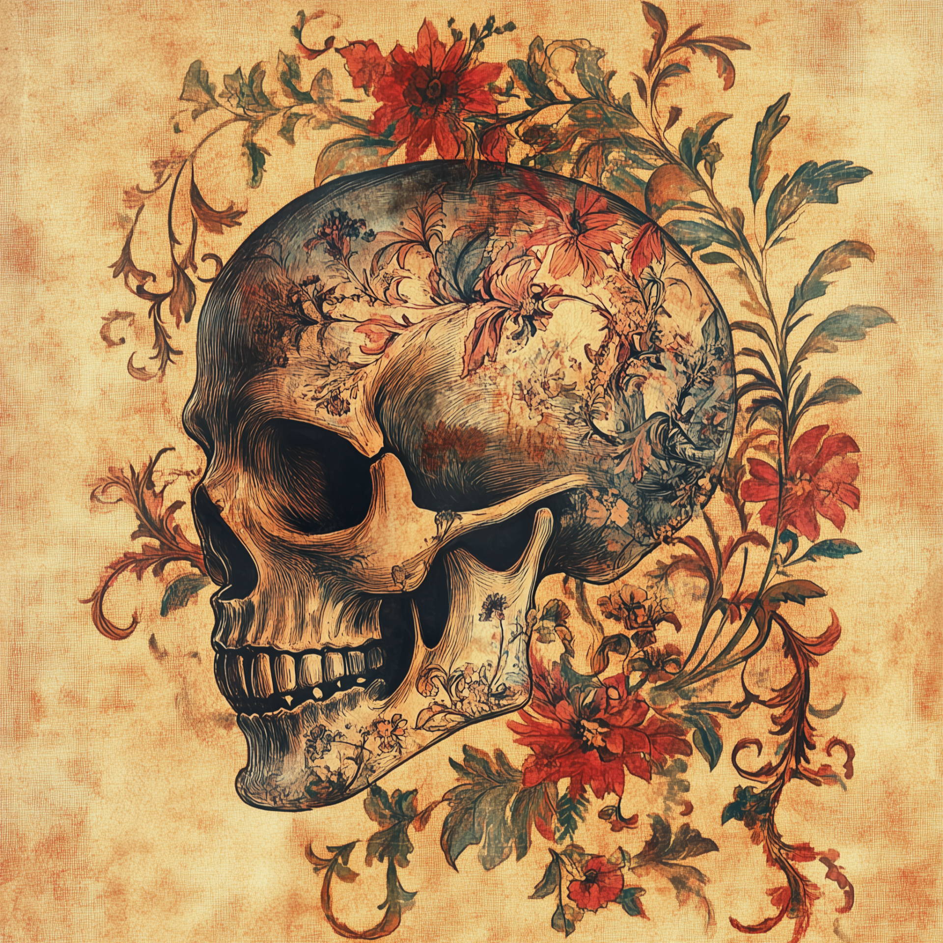 This illustration showcases a baroque-style skull depicted in profile, adorned with rich, vivid colors and intricate vegetal patterns. The high-quality design is set against a parchment background, evoking a sense of depth and artistry.