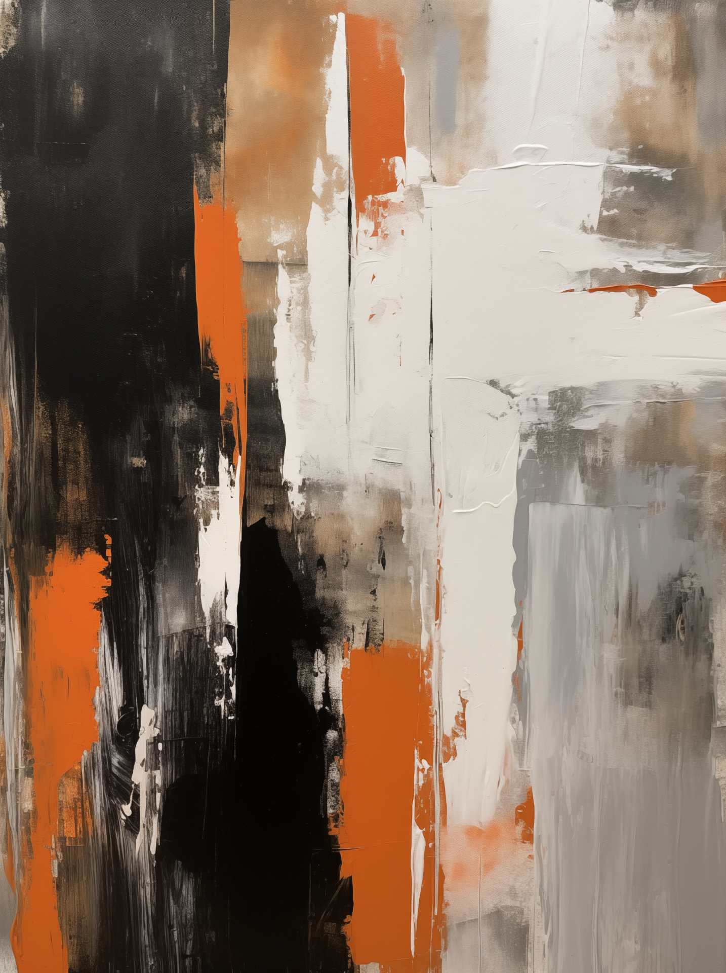 This artwork features a striking abstract design with bold black, white, and orange paint strokes. The composition embraces a minimalist style, emphasizing clean lines and neutral tones.