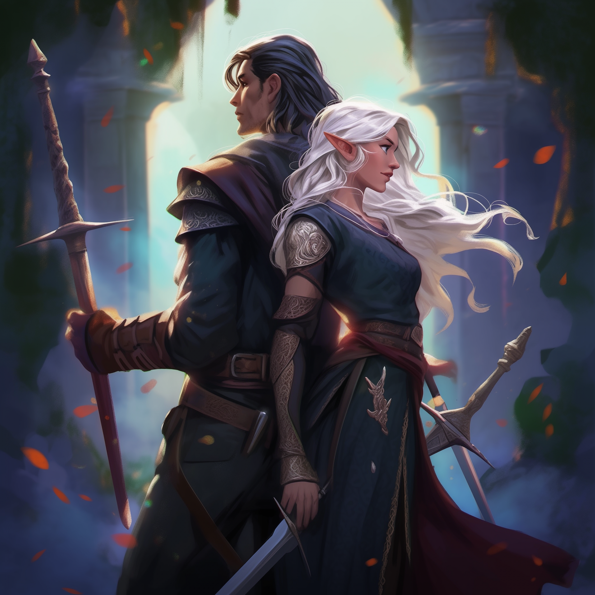 A dynamic scene featuring a couple standing back to back in a fierce combat pose. The composition captures movement amidst a crumbling temple bridge, highlighted by dark colors and an enchanting fantasy atmosphere.