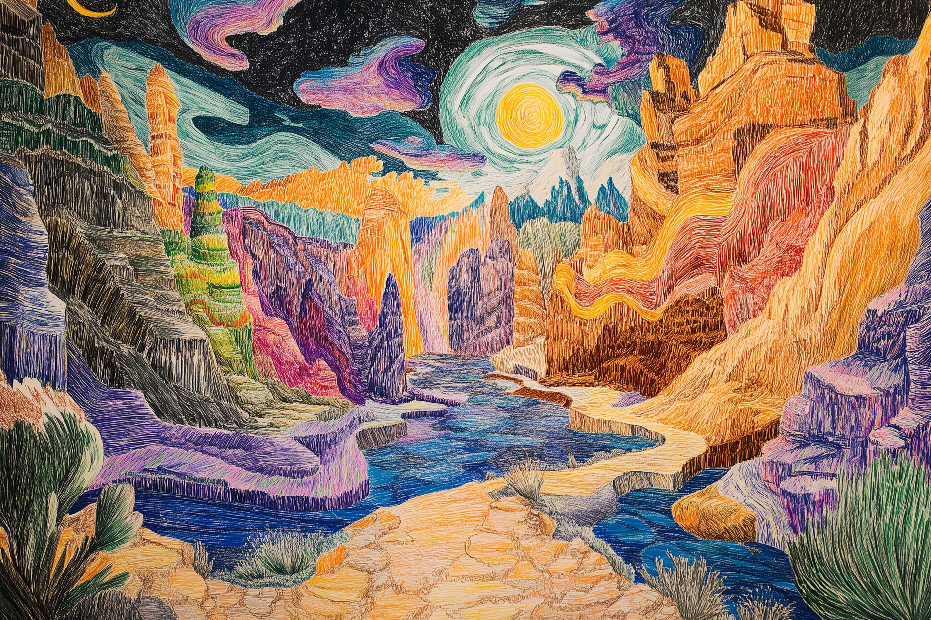 This artwork features a vibrant landscape of the Grand Canyon, showcasing its iconic formations and expansive views. The use of color pencils adds a unique texture and depth, creating a visually striking representation of this natural wonder.