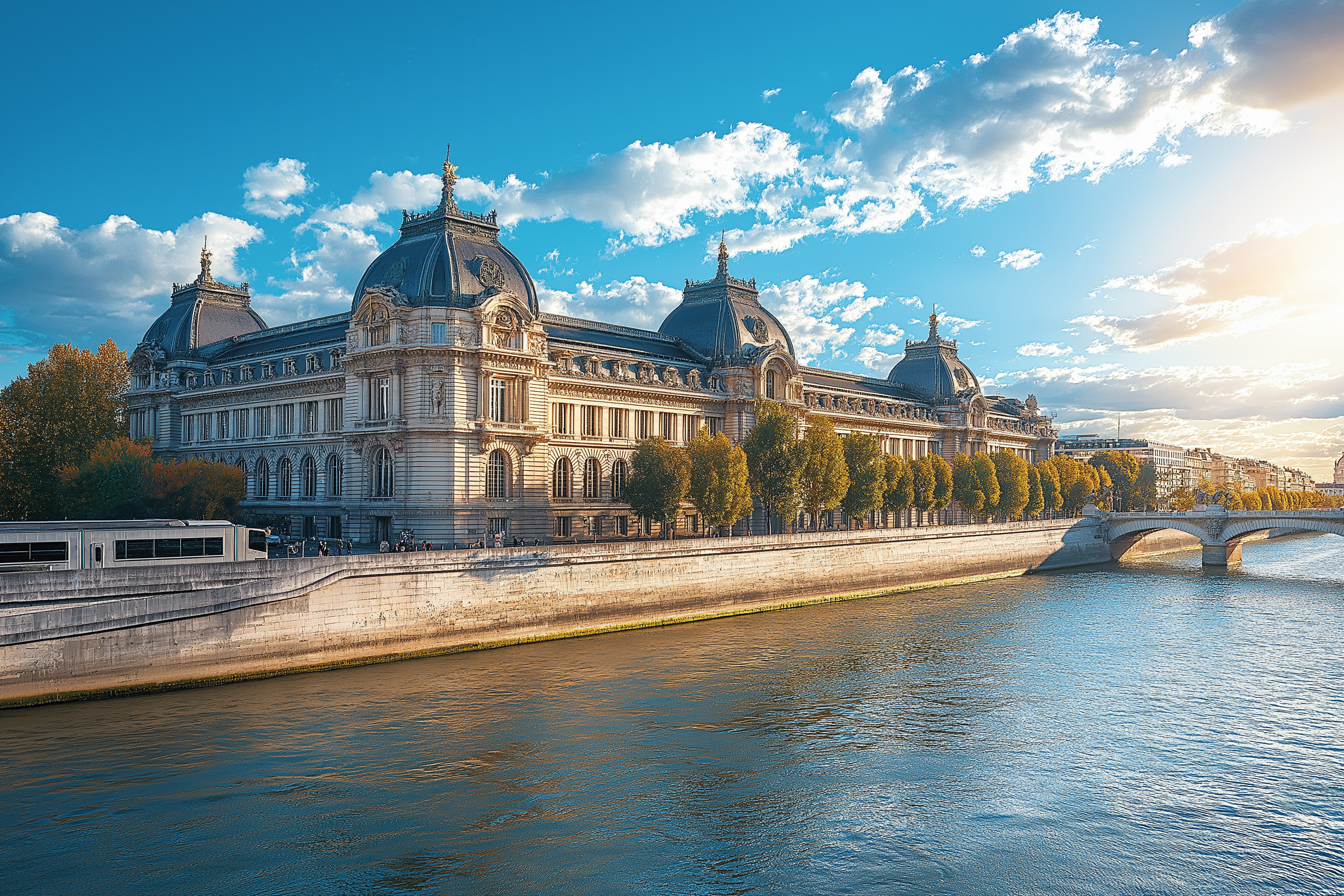 The image showcases the stunning Orsay Art Museum under a bright blue sky, surrounded by fluffy white clouds. The River Seine flows gently in the foreground, reflecting the beauty of the museum and the clear day.