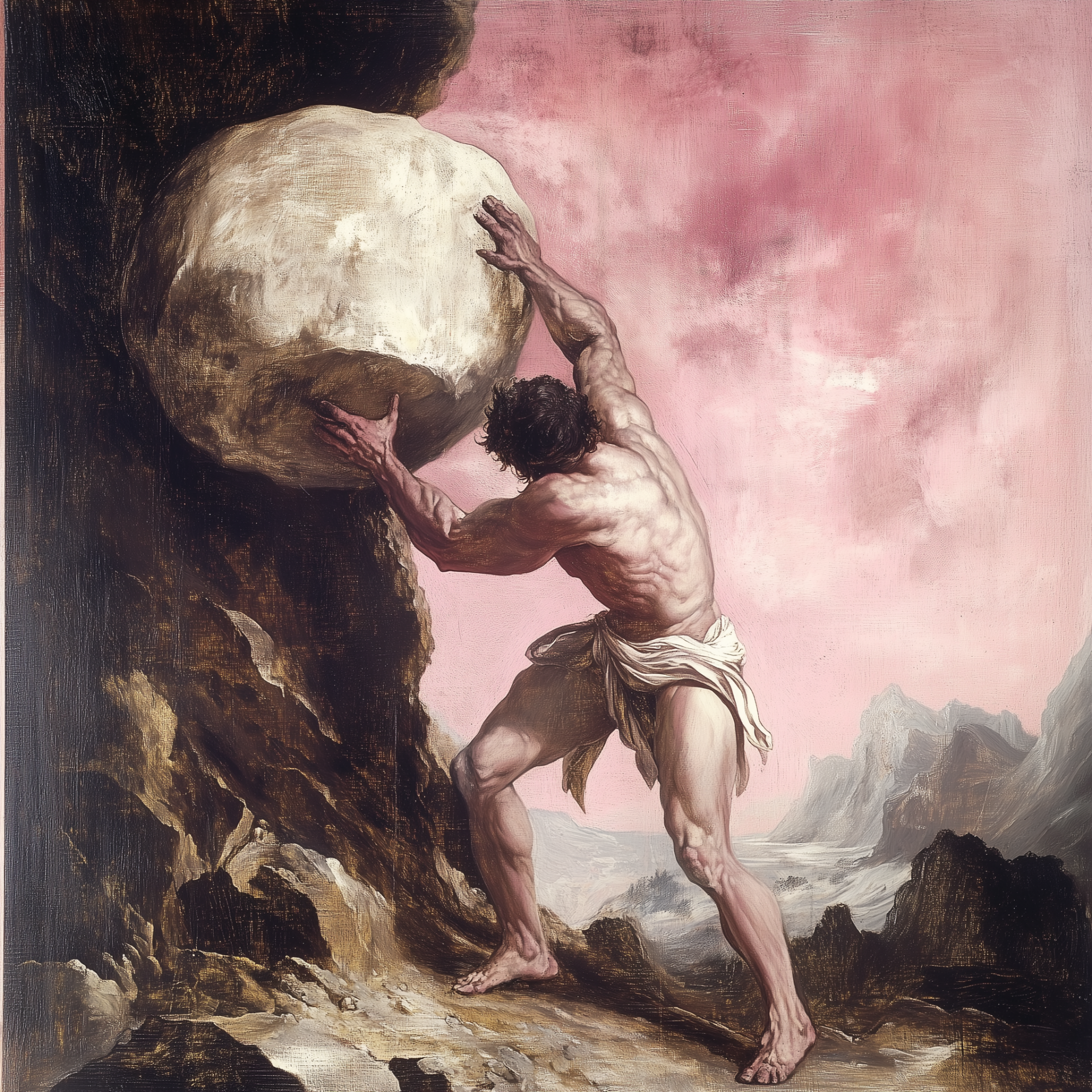 This illustration features a pink-colored adaptation of the mythological figure Sisyphus, dramatically pushing a boulder uphill. The color palette and stylization evoke a sense of abstract art, blending mythical elements with modern aesthetics.