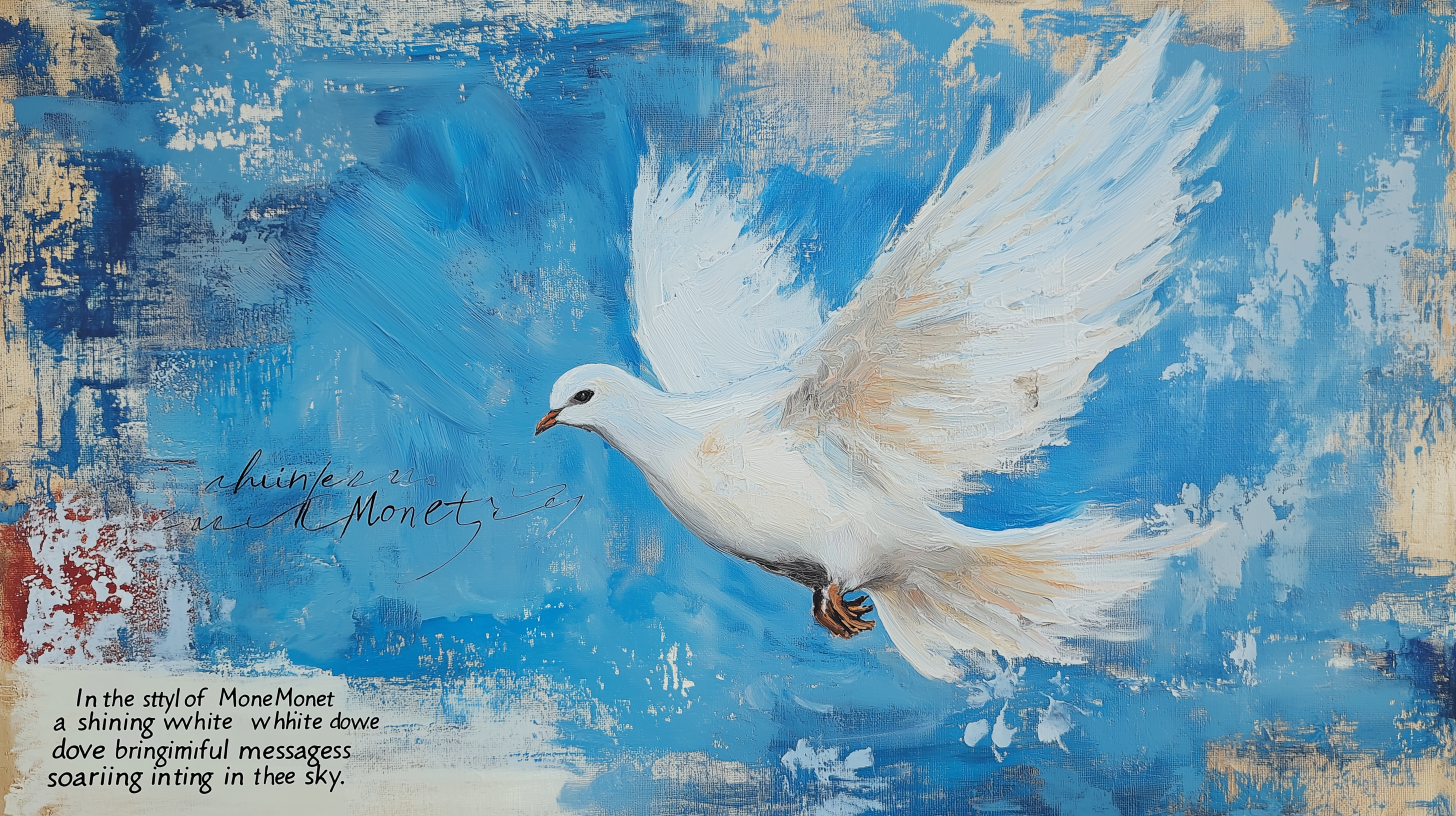 The image features a radiant white dove elegantly flying across a serene blue sky. With a soft, impressionistic style reminiscent of Monet, the colors blend harmoniously to evoke a tranquil atmosphere.