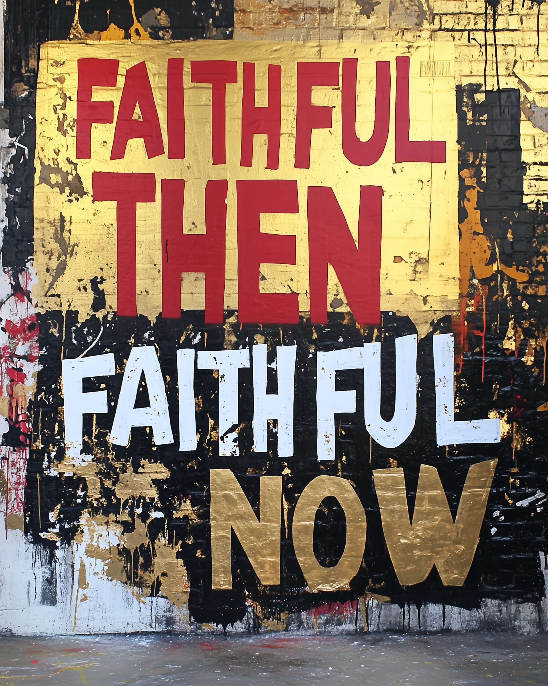 This vibrant graffiti art features the bold phrases 'FAITHFUL THEN' and 'FAITHFUL NOW' in large, striking letters. The artwork is painted in a mix of metallic gold, white, and red colors, creating a lively and compelling visual effect.