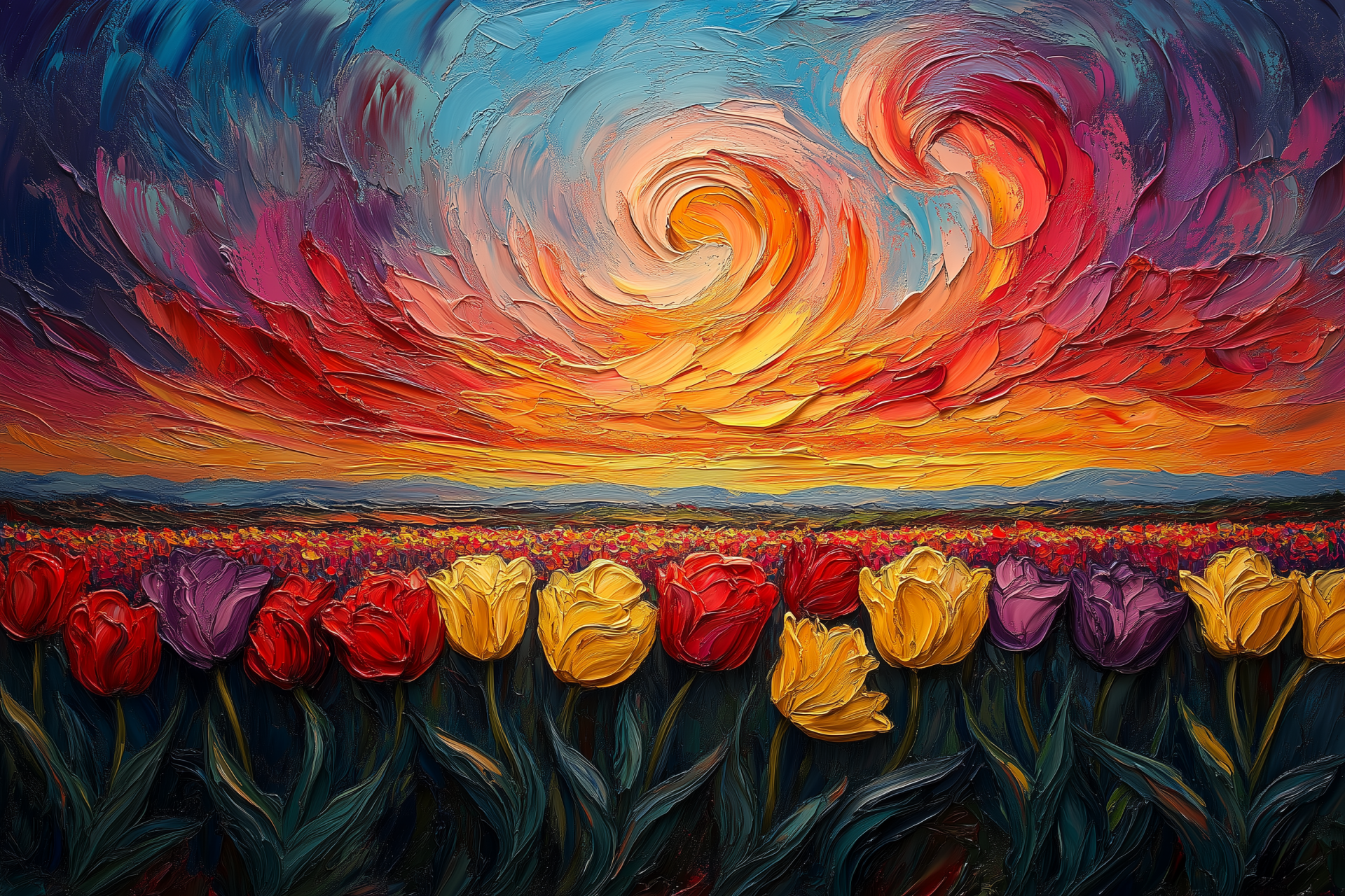 The image showcases a vivid landscape filled with blooming tulips under a vibrant sunset sky. Swirling colors of orange, pink, and purple create a dynamic and lively atmosphere, reminiscent of impressionist art.