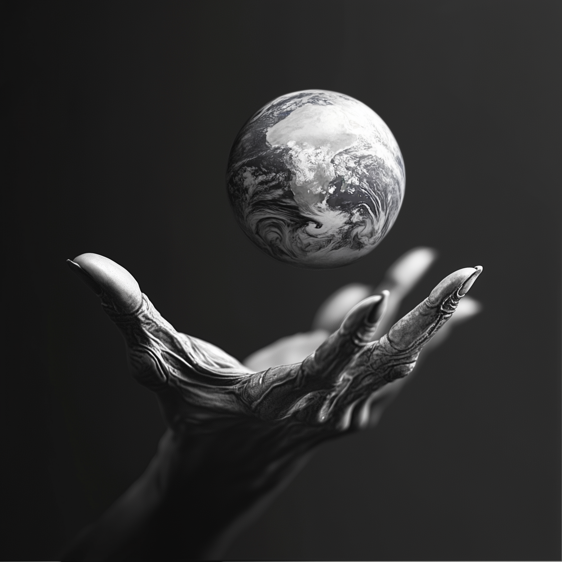 The image features a highly detailed and realistic alien hand reaching out towards a floating planet, set against a dark backdrop. The black and grey color palette enhances the mysterious and otherworldly atmosphere of the scene.