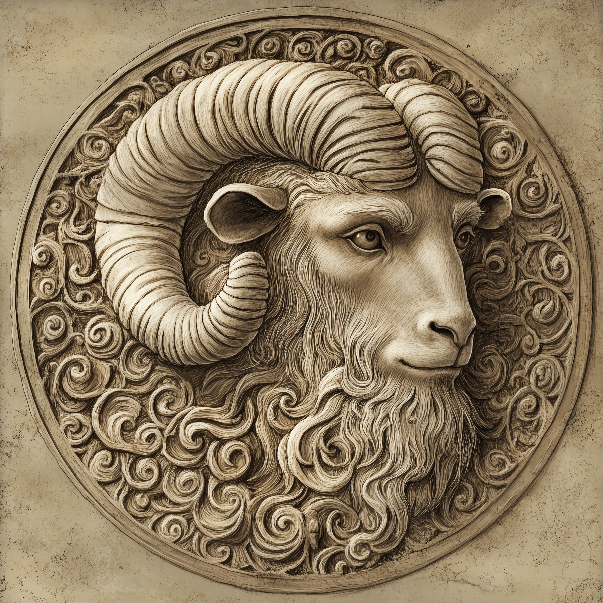 This illustration depicts Aries in an ancient Greek style, with sharp borders and high resolution, resembling a marble sculpture.